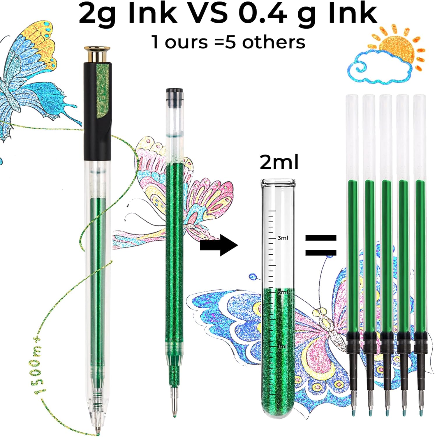 - Smooth Sparkle Glitter Writing Experience:Enjoy seamless, skip-free writing with our upgraded tip and free-flowing glitter ink system. With 5x more ink than standard gel pens, your creations stay vibrant without fading. The convenient retractable design eliminates lost caps while the secure anti-drop mechanism keeps pens safe. Non-toxic, acid-free formula is perfect for all ages. Tip: Wipe wax coating before first use.