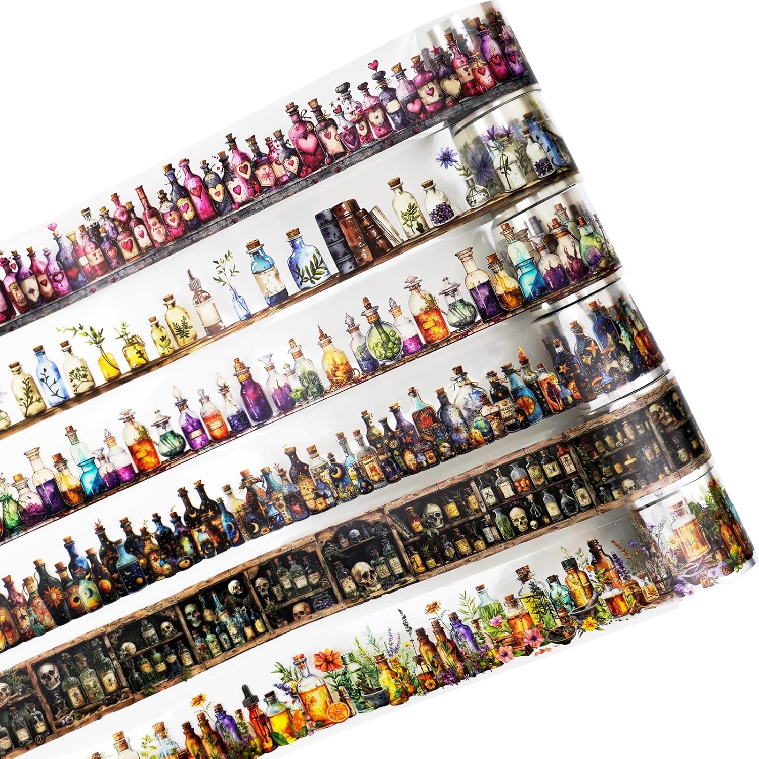 6 Rolls Witch Potion Bottle PET Tape Set with Clip, Waterproof Gothic Scrapbook Sticker Rolls for Journaling, Bullet Journals, and Dark Aesthetic Crafting