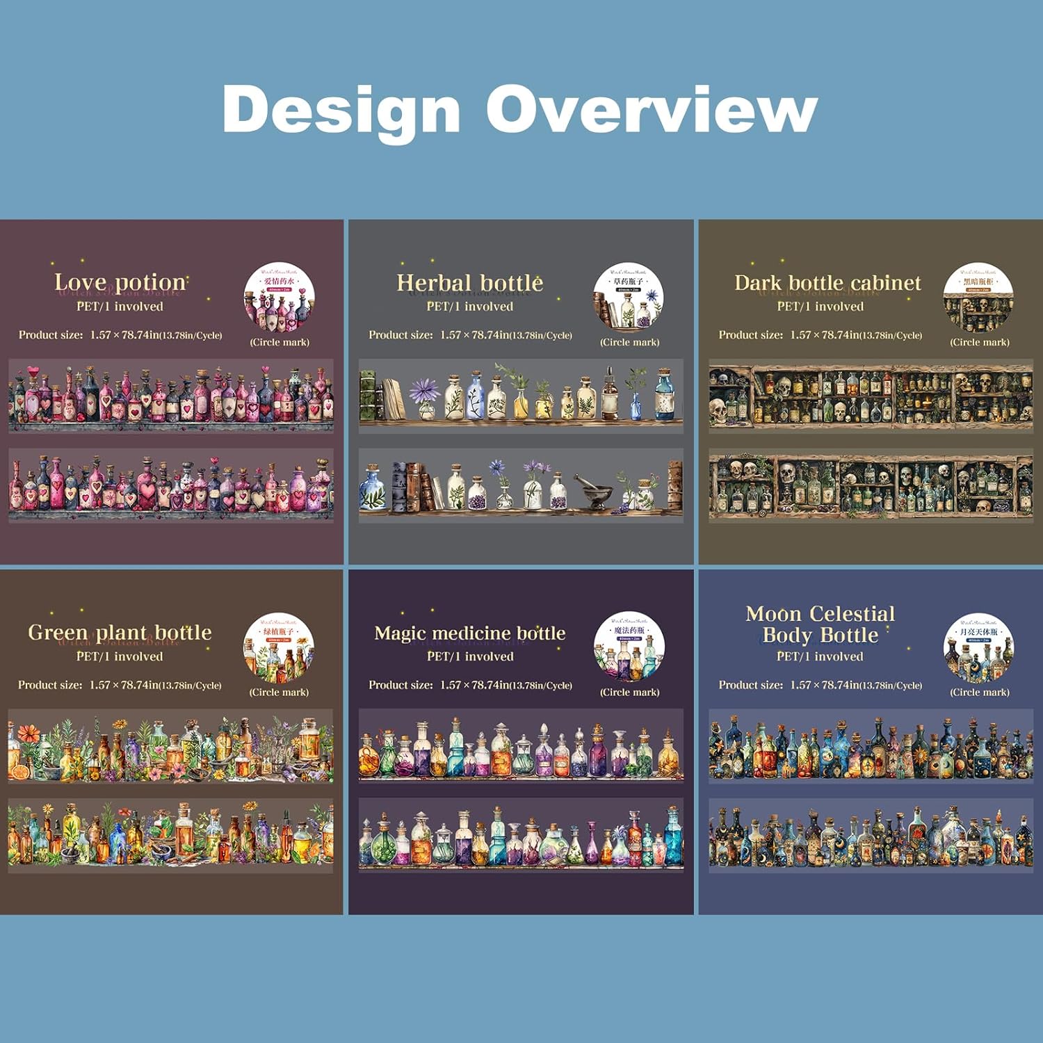 - Whimsical Potion Designs: 6 rolls of fantasy-themed PET tapes, each measuring 1.57in x 78.74in, showcase mystical potion bottles with floral, celestial, and gothic cabinet styles, adding enchantment and charm to any paper project