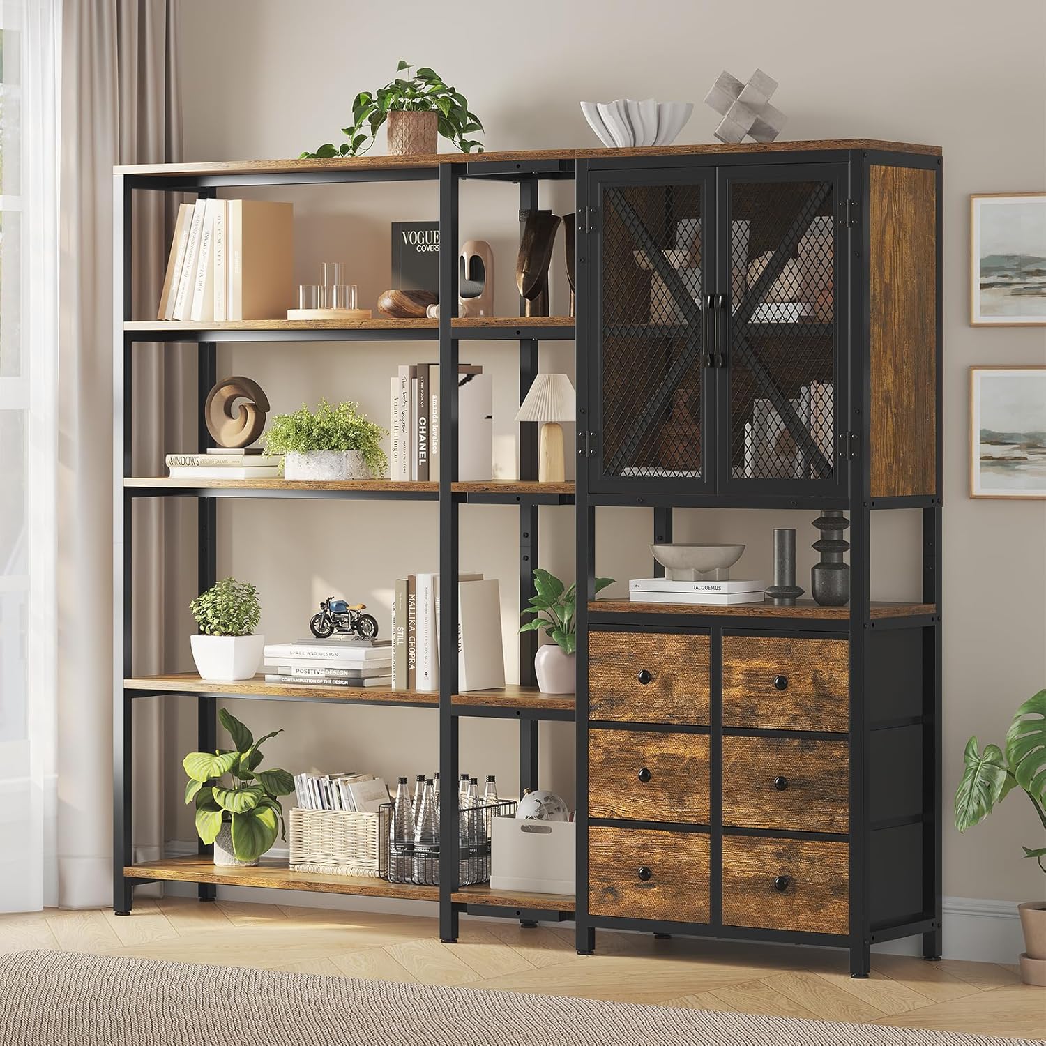 - 【Storage Mastery】-5 Tier bookcase shelves ample room to showcase your favorite books, decor, and keepsakes with style,6 storage fabric Drawers,1 adjustable storage cabinet, keep your items neatly tucked away, It's more than just storage—it's a statement piece that keeps your home tidy and everything easily accessible