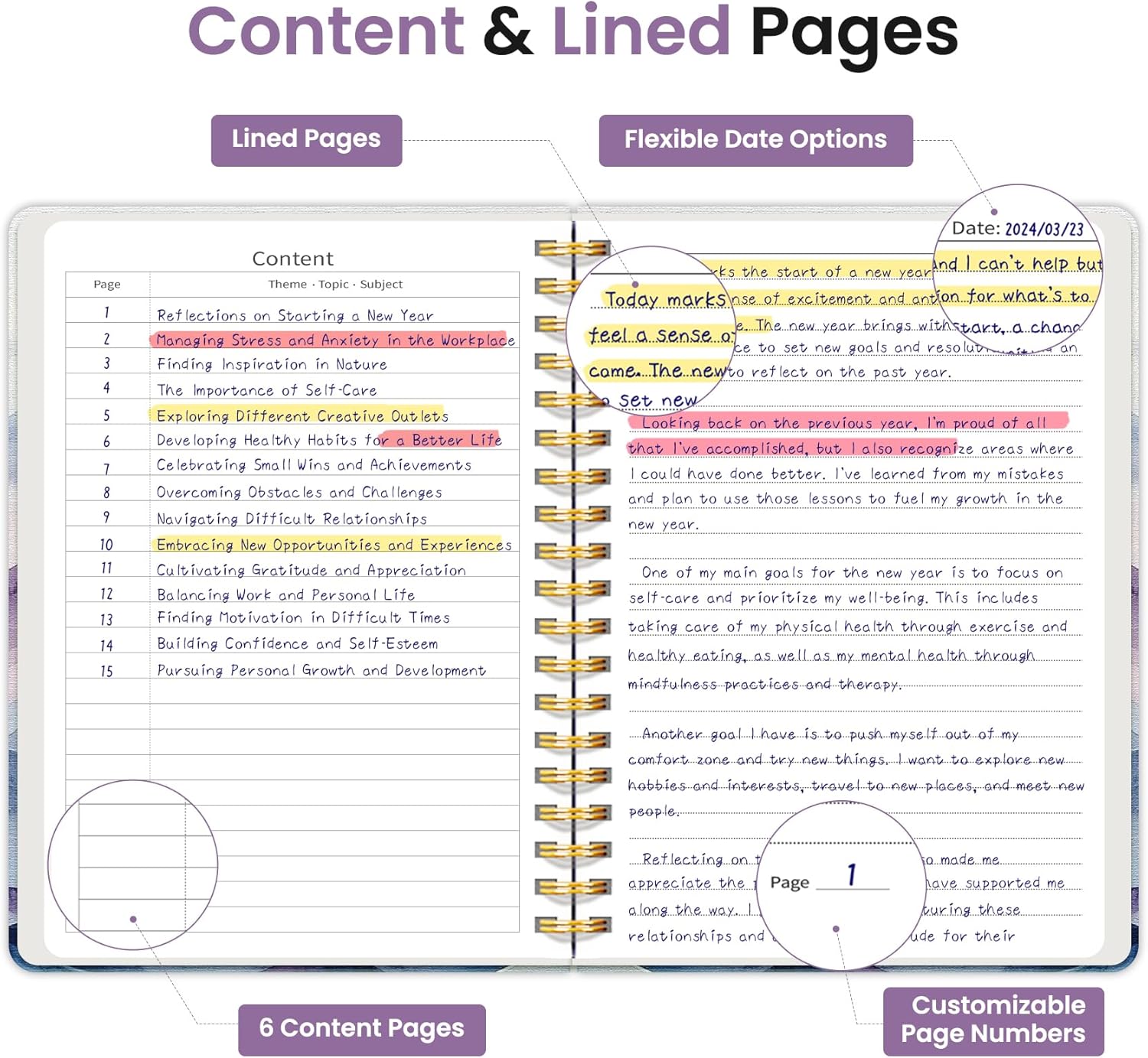 - Structured College-Ruled Pages: Featuring 7mm college-ruled lines, this journal notebook helps keep your writing organized and legible. The evenly spaced lines are perfect for structured notes, work lists, or detailed writing, making it an excellent choice for school students, professionals, and writers alike. It also includes 6 content pages, perfect for creating an index for easy reference.