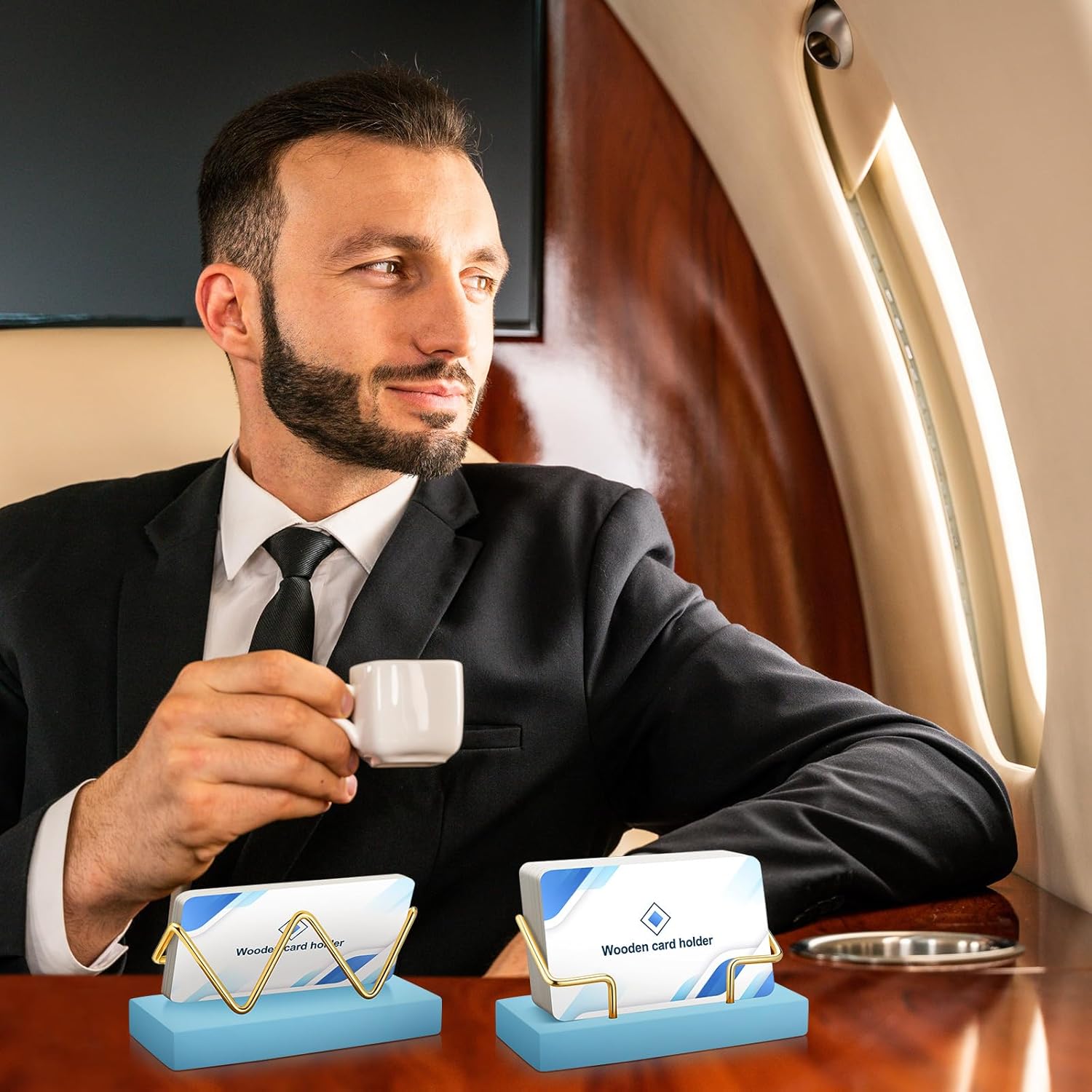 Amyhill 2 Pieces Wood Business Card Holder for Desk Wooden Business Card Display Stand Postcard Holder for Office Home Desktop (Blue Color, Gold)