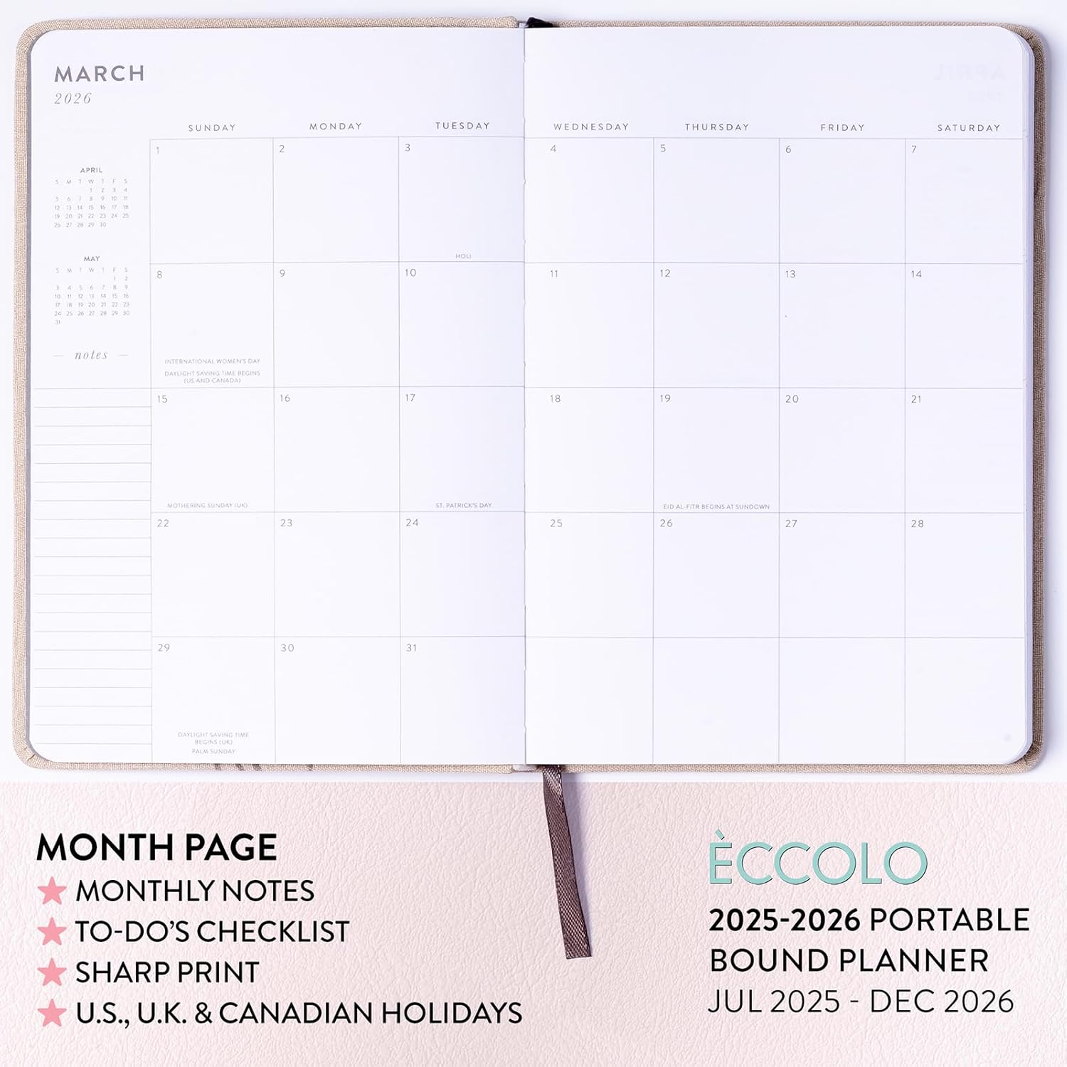 2025-2026 Eccolo 18 Month Linen Bound Planner, Monthly & Weekly Pages (5.25 x 7.75" - July 2025 - Dec 2026)