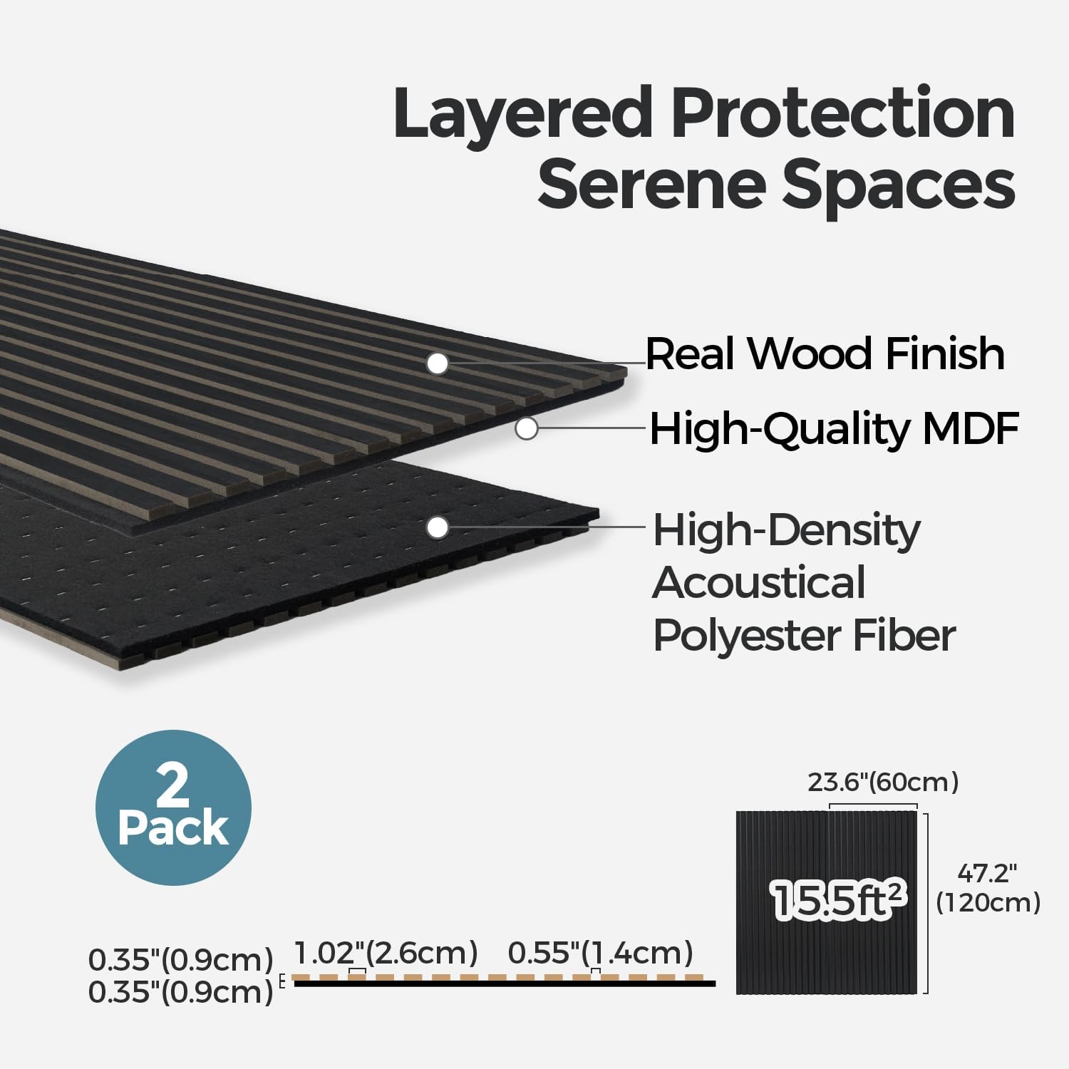 - 【Product Size & Options】Each panel measures 23.6" x 47.2" x 0.7". Sold as a 2-pack covering a total of 15.5 ft². Available in 4 wood-grain finishes: Walnut, Siner Oak, Black Oak, and Classic Oak. Suitable for offices, bedrooms, living rooms, music rooms, and other interior applications.