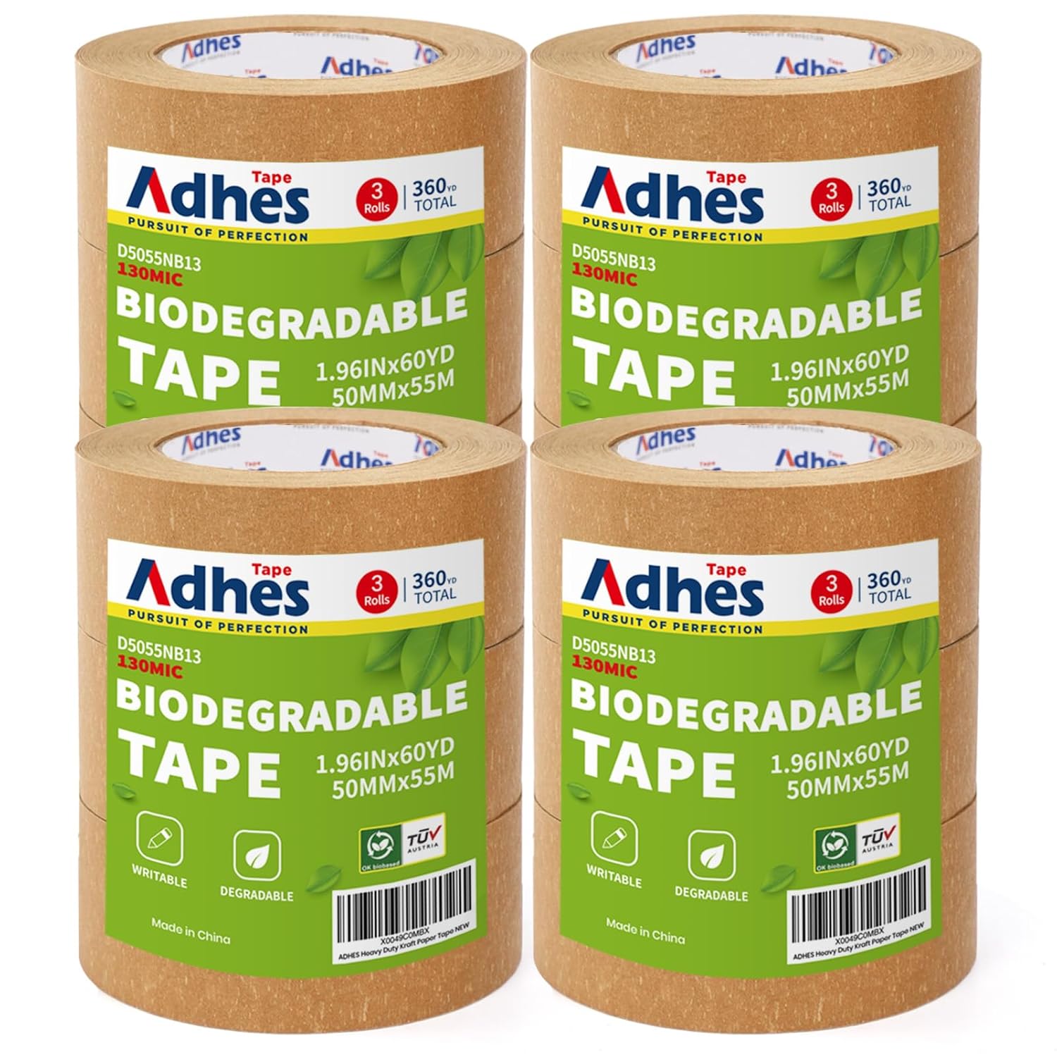 ADHES Kraft Paper Tape, 2 Inch x 60 Yards x 12 Rolls, Biodegradable Paper Packing Tape Writable & Uncoated Brown Shipping Tape for Shipping, Moving, Sealing