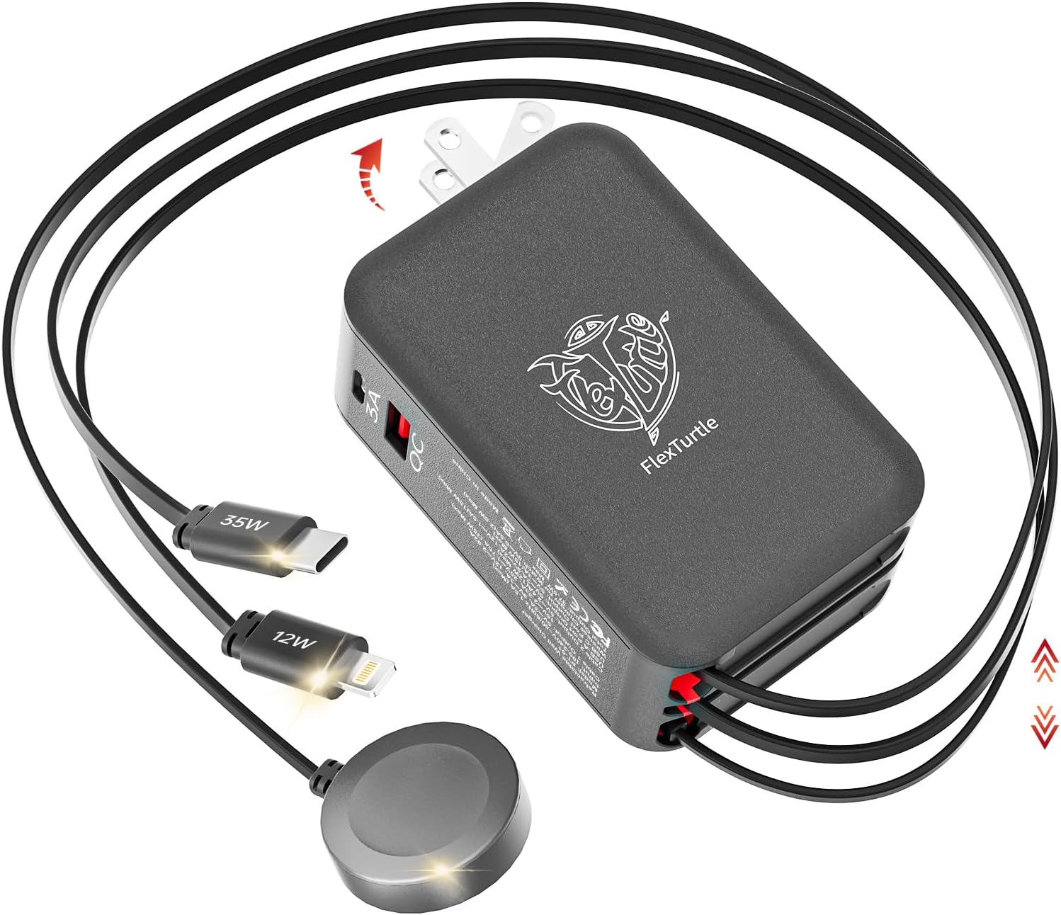 - 【Space-Saving Retractable Design 】-The FlexTurtle retractable phone charger wall plug features three 3.2ft retractable cables (USB-C, Lightning, and Apple Watch), eliminating clutter. Perfect as a phone charging station for desks, nightstands, or as travel accessories for women and men