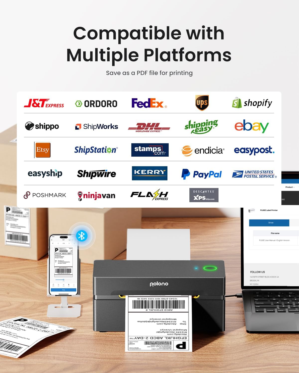- Printing via USB: For both Windows and Mac, you can connect the shipping label printer using a USB cable. This thermal printer is easy to set up and use, ideal for small businesses. Wide Compatibility 4x6 inch Thermal Printer for Shipping Packages. You can refer to the operation video and manual to set it up. Note: PL80E shipping label printer doesn't support Chrome OS