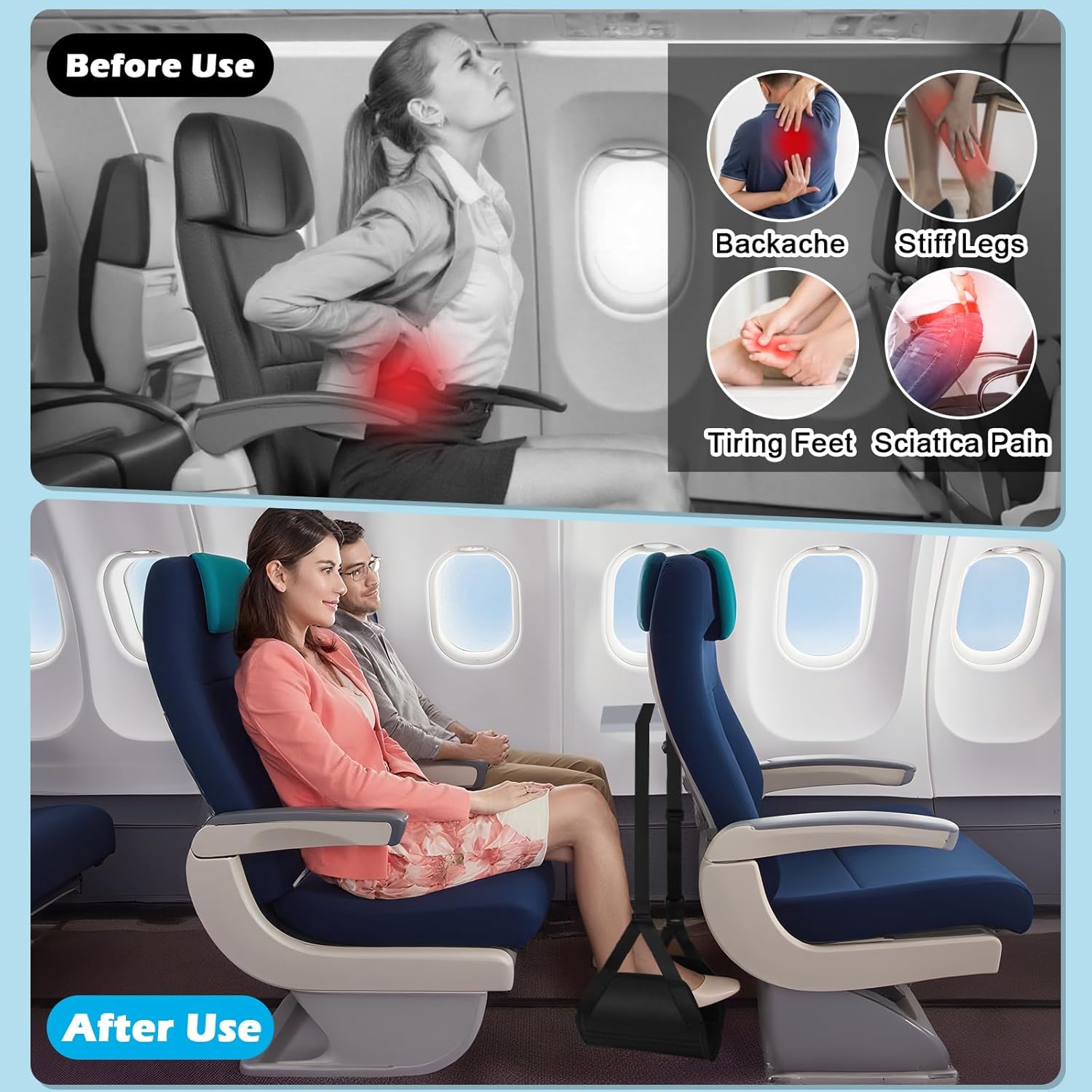 - 【Detachable Airplane Foot Hammock】 The wider airplane foot hammock with removable sturdy support foot pads, elevate your comfort. Its stable design effectively supports foot weight, preventing foot compression. By adjusting the usage method, easily raise your legs for better posture,relieving leg fatigue and swelling caused by prolonged sitting or long-distance travel. Helps you stretch and relax, making this a great airplane gadget for restful travel.