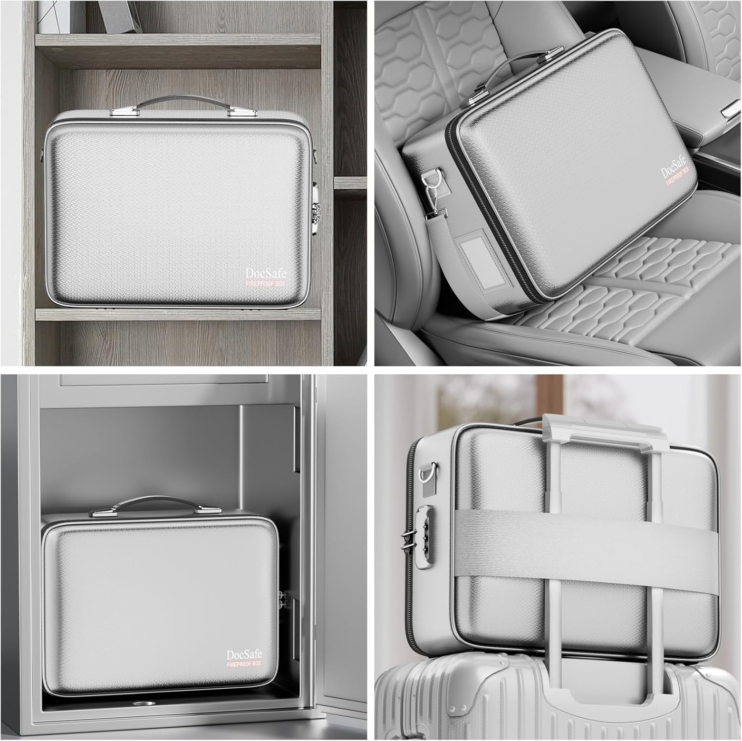 - Fireproof Box with Lock: Protect your valuables with the built-in high-quality combination lock (No keys required). Design with a strong handle๏ผa detachable shoulder strap for carrying everything you needed easily. The fireproof box is suitable for business, travel, office, school, home storage, of course, giving it as a gift to your family is also a good choice. Fireproof box is both fireproof and water-resistant, ensuring your documents stay protected during fires, floods, or wet weather