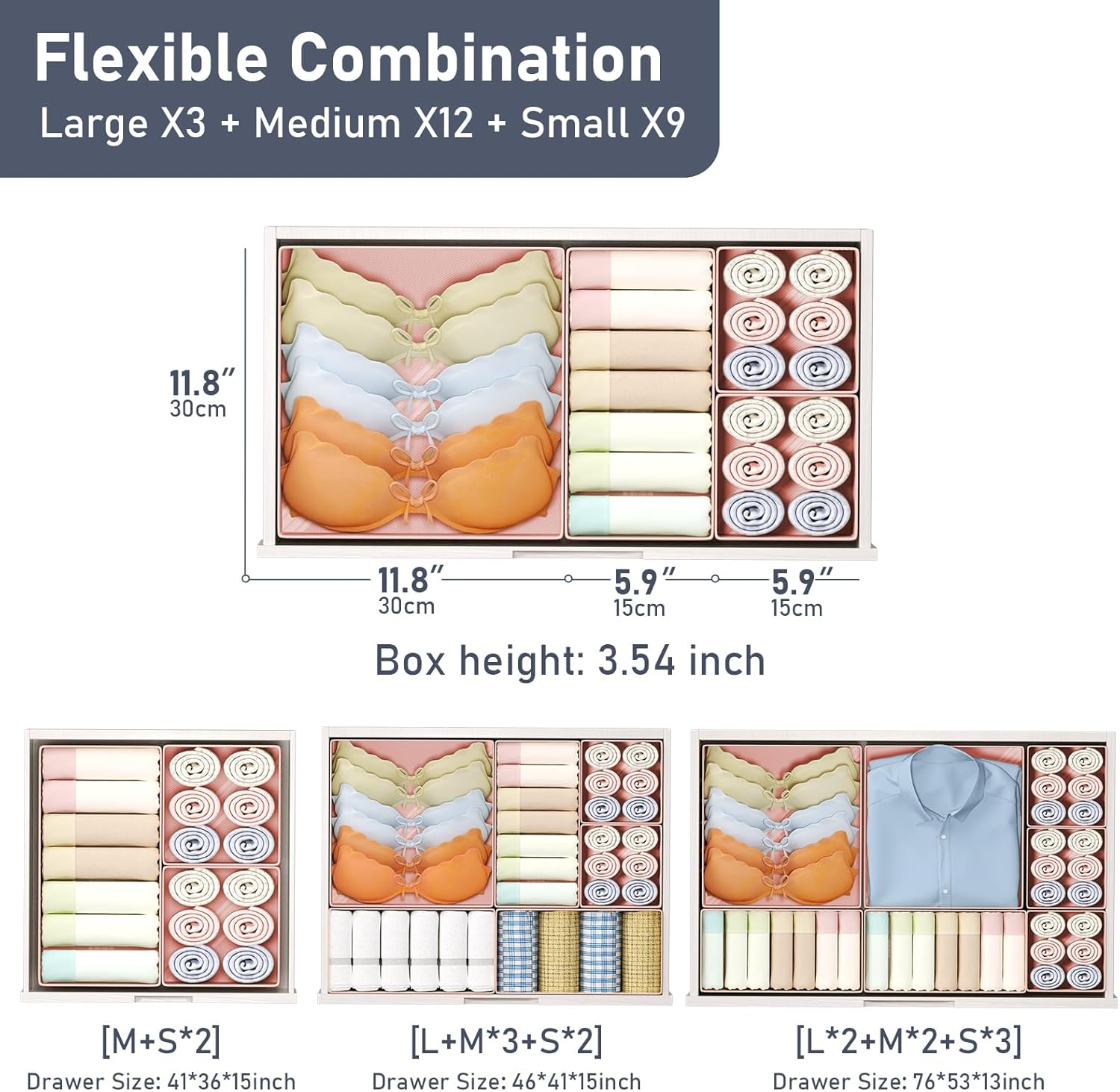 - Free Combination: This drawer organizer clothes set includes 3 large square boxes (11.8"x11.8"x3.54"), 11 medium containers (11.8"x5.9"x3.54") and 6 small bins (5.9"x5.9"x3.54"). A variety of sizes can be flexibly combined to meet different storage needs. The small drawer organizer can be freely configured in wardrobes and other spaces to achieve efficient and personalized classification and organization
