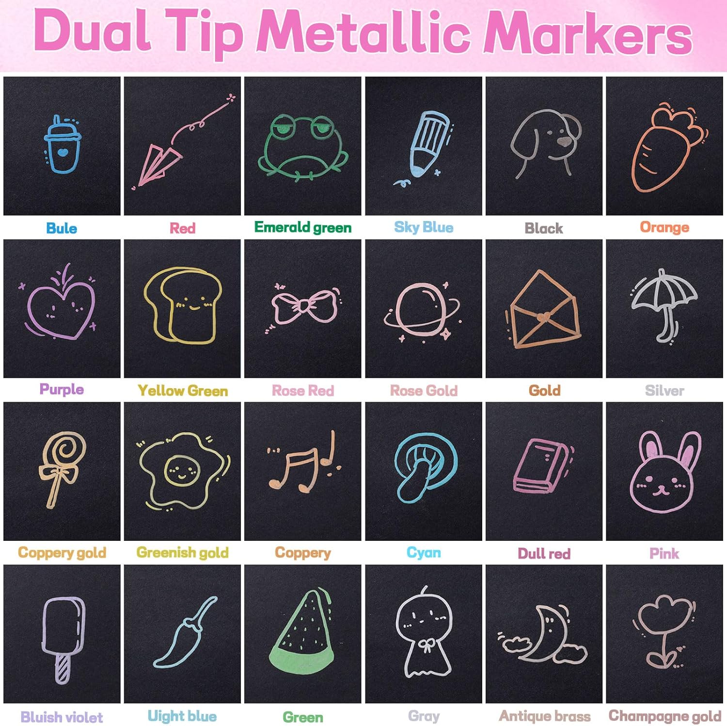 24 Pack Metallic Markers, Dual Tip Glitter Pens for Black Paper & Rock Painting Metallic Acrylic Paint Markers for DIY Crafts, Scrapbooking, Glass, Wood, Cards Alcohol Based Quick Dry Ink
