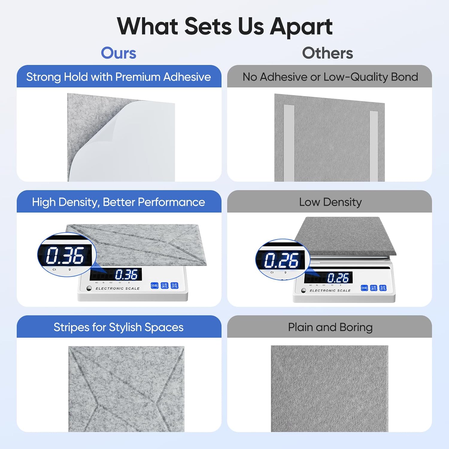 - Effortless Installation -- Each acoustic panel comes with a strong self-adhesive backing—just peel and stick. No tools, nails, or extra adhesives needed.