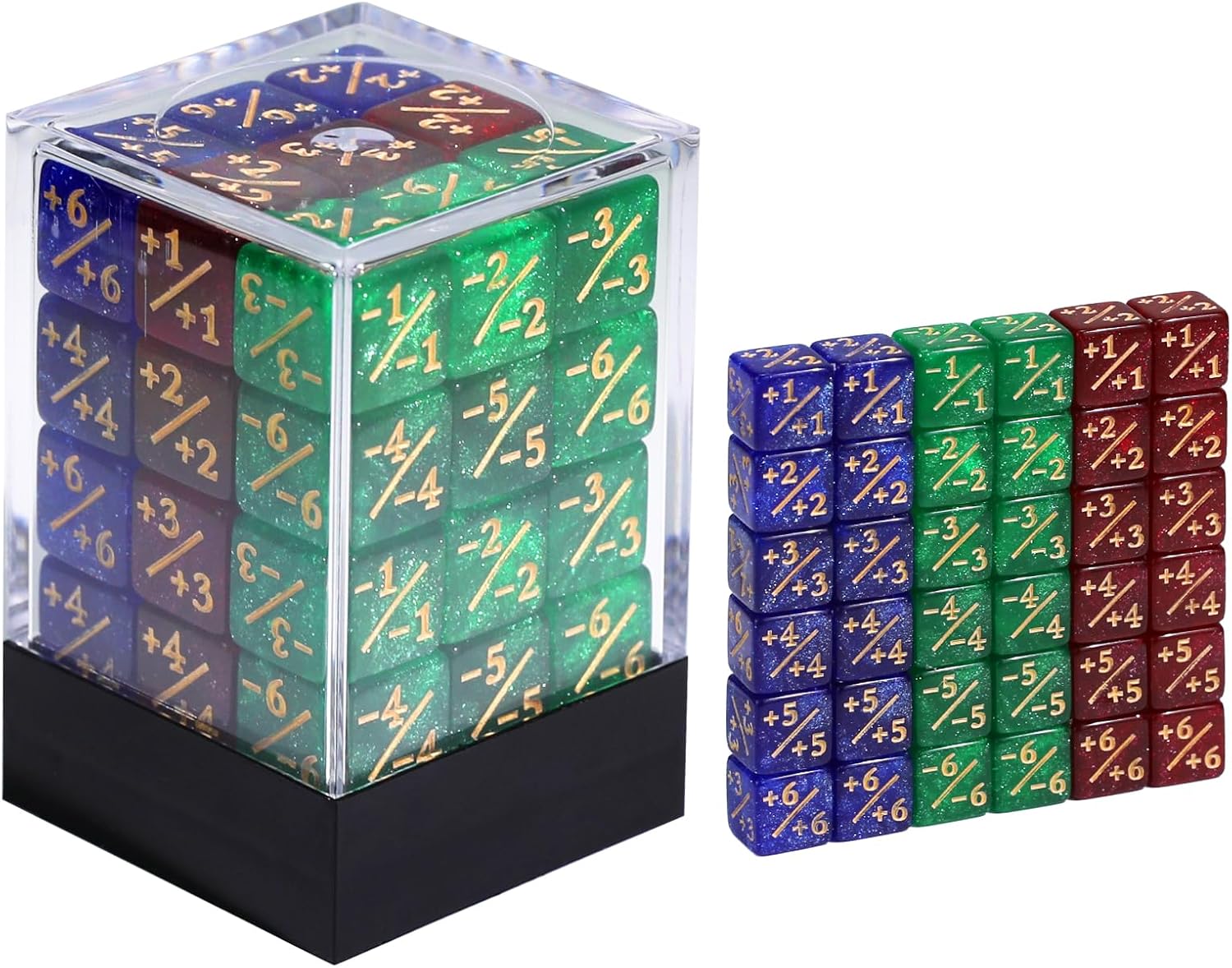 - PACKAGE INCLUDED - Comes with 36pcs 12mm counter dice set and a portable plastic box. Include 36pcs dice counters(24pcs +1~+6 & 12pcs -1~-6). They come neatly packaged in a reusable plastic case to keep your dice organized for easy storage and carrying of large quantities of dice.