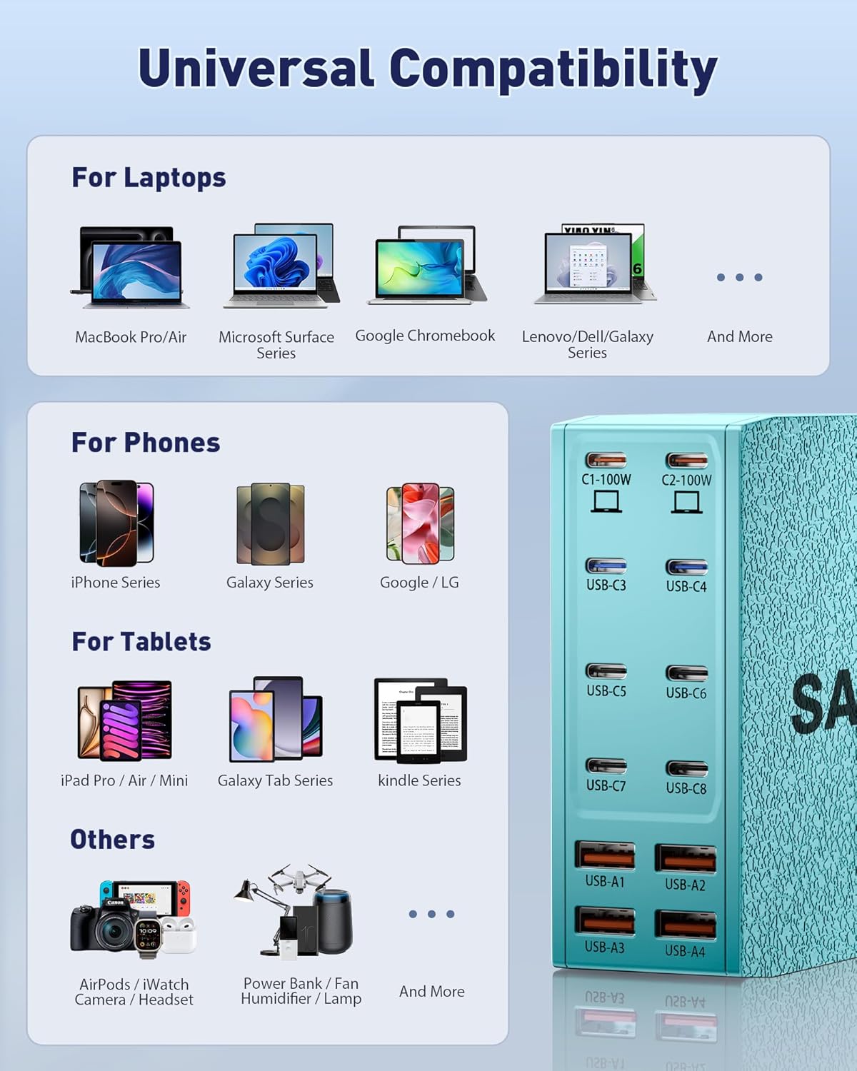 - ăUniversal CompatibilityăOur USB C charging station is equipped with 2*100W and 2*65W fast charging ports, which can charge 3 or more laptops at the same time. Compatible with smartphones, tablets and laptops, suitable for MacBook Pro/Air, Dell XPS, iPad Pro, Phone 16/16 Pro Max, Phone 15 Pro Max, Phone 14/13 Pro/12 Pro Max, iWatch, AirPods, Surface Pro, Galaxy S24 Ultra, Switch, Steam Deck, Google Pixel and many other devices.