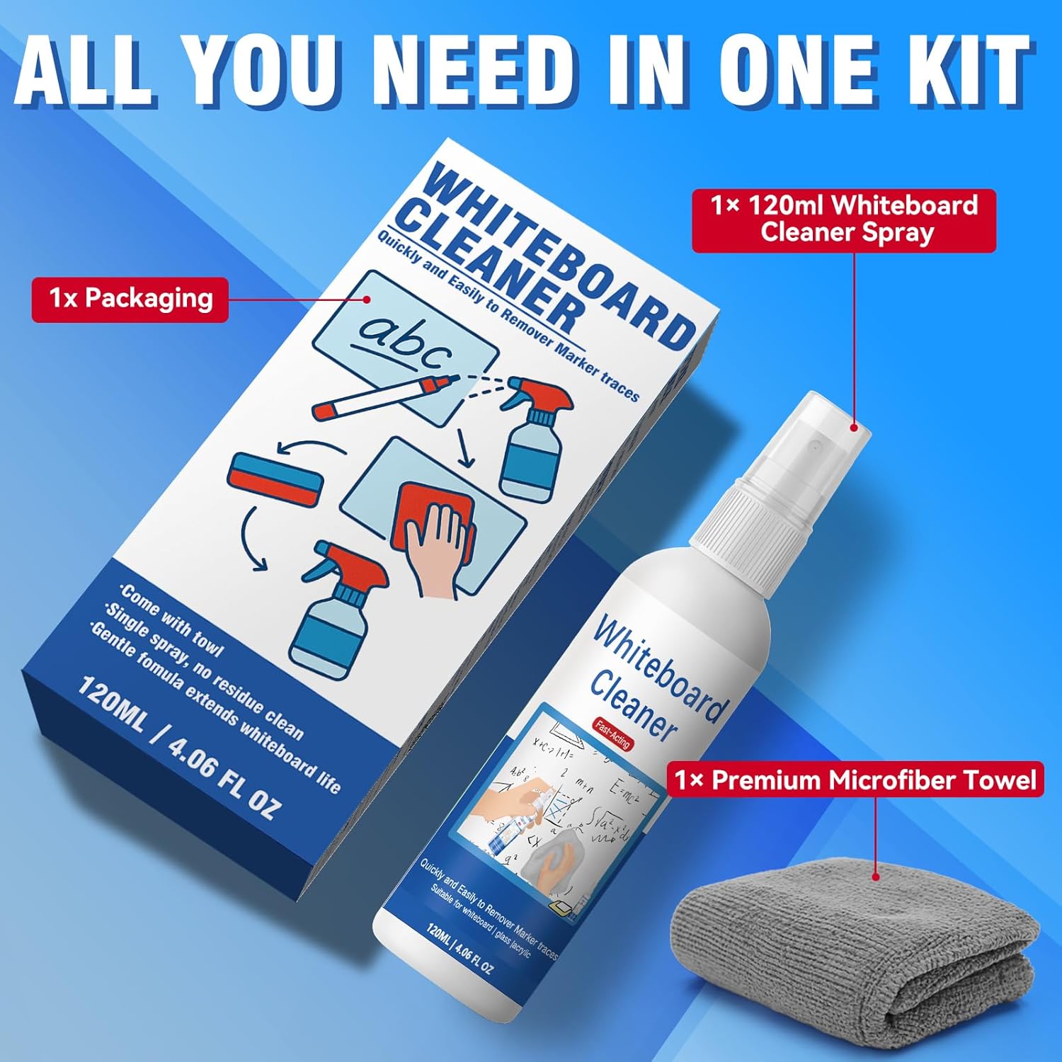 Whiteboard Cleaner, Low-Odor Dry Erase Board Cleaner with Cloth, White Board Cleaning Spray for Classroom, Home and Office Use, Removes Marks from Whiteboards, 4.06oz