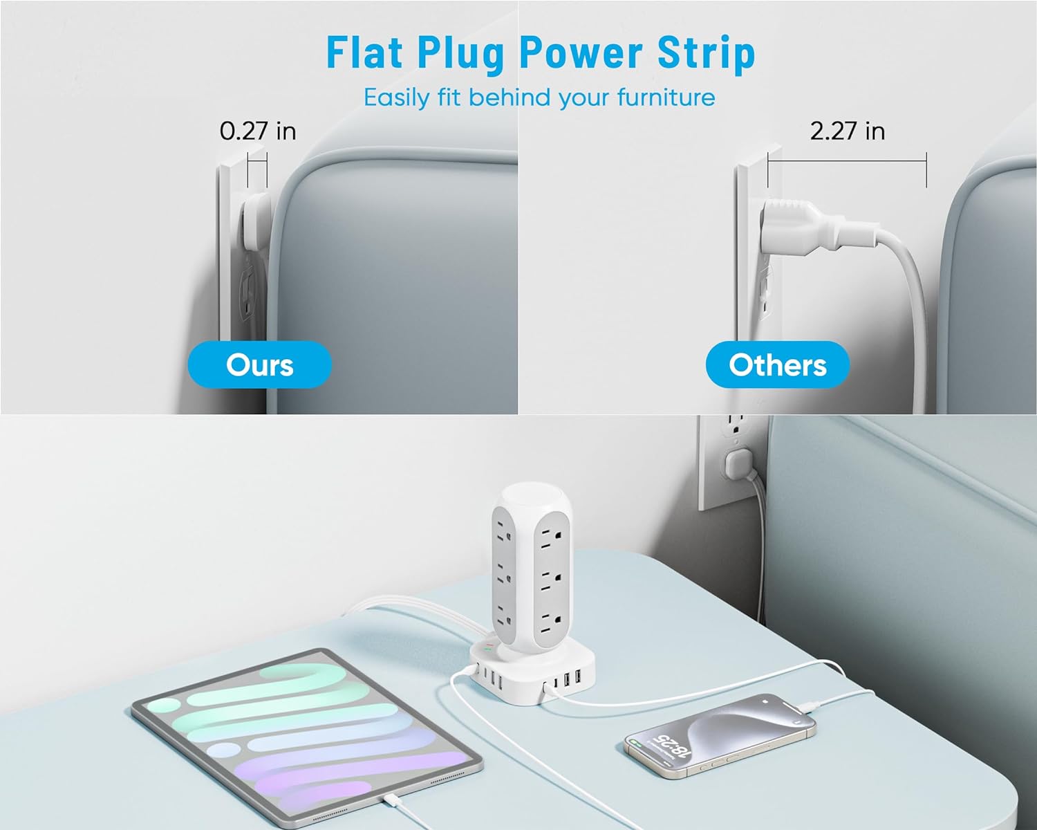 - 【20 IN 1 Power Strip Tower with USB】- This vertical power strip with USB ports features 12 AC outlets and 8 smart-charging USB ports(2 PD 20W USB-C).It can charge 20 devices simultaneously without blocking, keep your desktop organized, widely use in home/office/dorm room. (Note: Please do not exceed the rated power 1875W ).