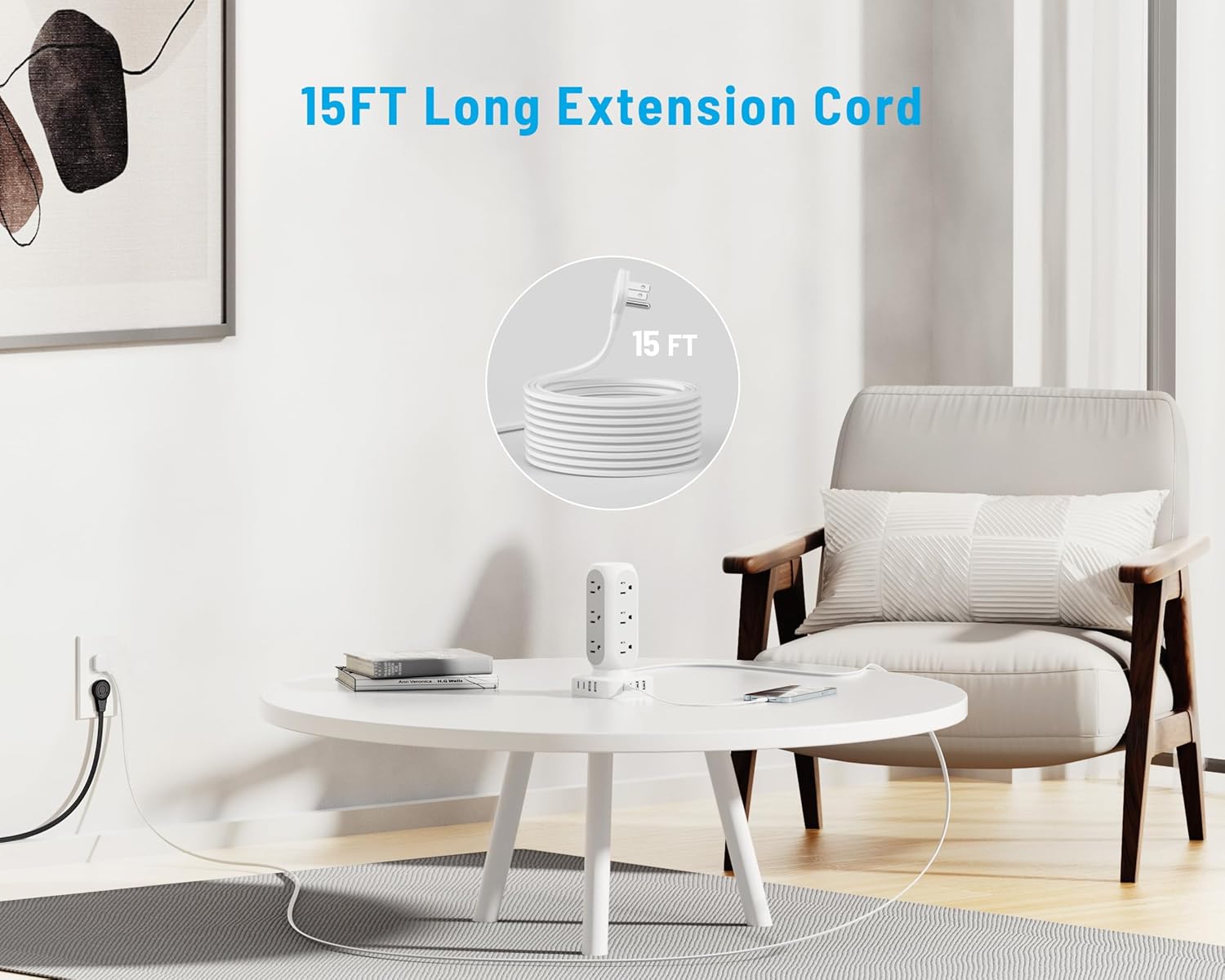 Flat Plug Power Strip Tower, 40W Total Fast Charging Station, Dual PD 20W USB-C Surge Protector with 12 AC Outlets and 8 USB Ports (4 USB C), 15FT Extension Cord for Home Office Dorm Room