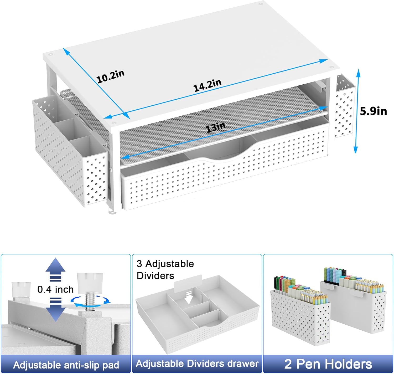 - High-quality materials: The computer monitor stand riser is made of durable wood and a sturdy steel pipe frame, allowing it to withstand years of use and reliable performance. The drawer and 2 hanging pen holders are made of high-quality environmentally friendly plastic, which is thick and durable while making the product more beautiful