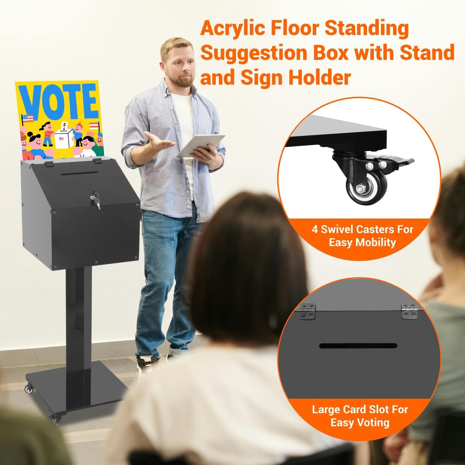 - High-Quality Acrylic Construction: The donation box with stand crafted from durable, black acrylic for a sleek, modern appearance that ensures long-lasting use in high-traffic areas