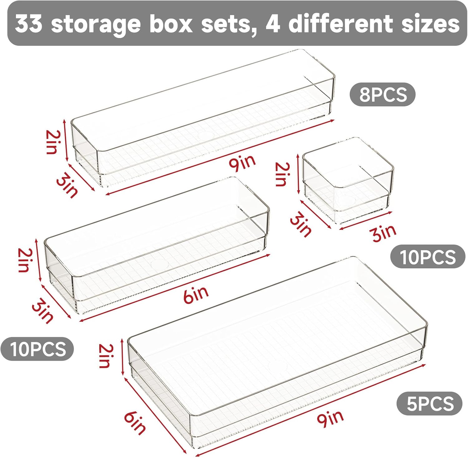 33 PCS Clear Plastic Drawer Organizer Set, 4 Sizes Acrylic Drawer Storage Trays Non Slip Storage Bins for Makeup, Jewelry, Gadgets for Kitchen, Bedroom, Bathroom, Office