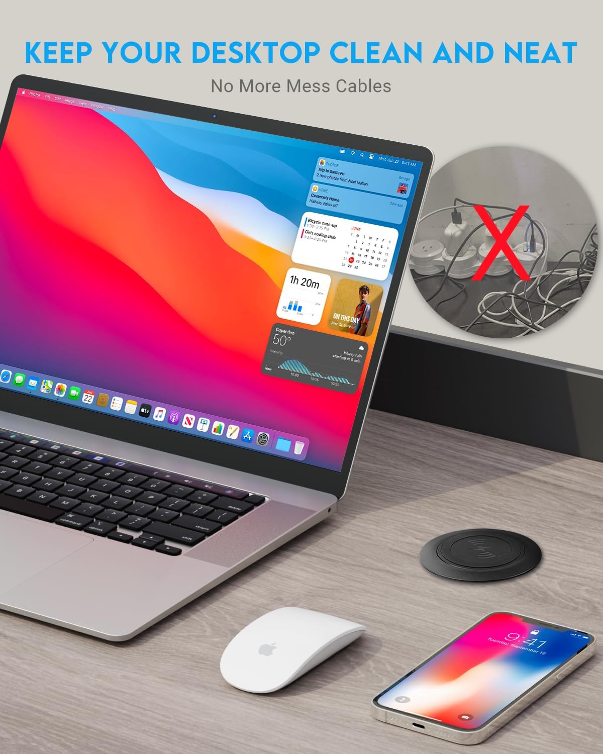 - Phone Charger with Hidden Design: The recessed desk charger is a round invisible mounted charger that saves space. When not in use, it can be perfectly integrated into the environment, keeping the space clean and beautiful