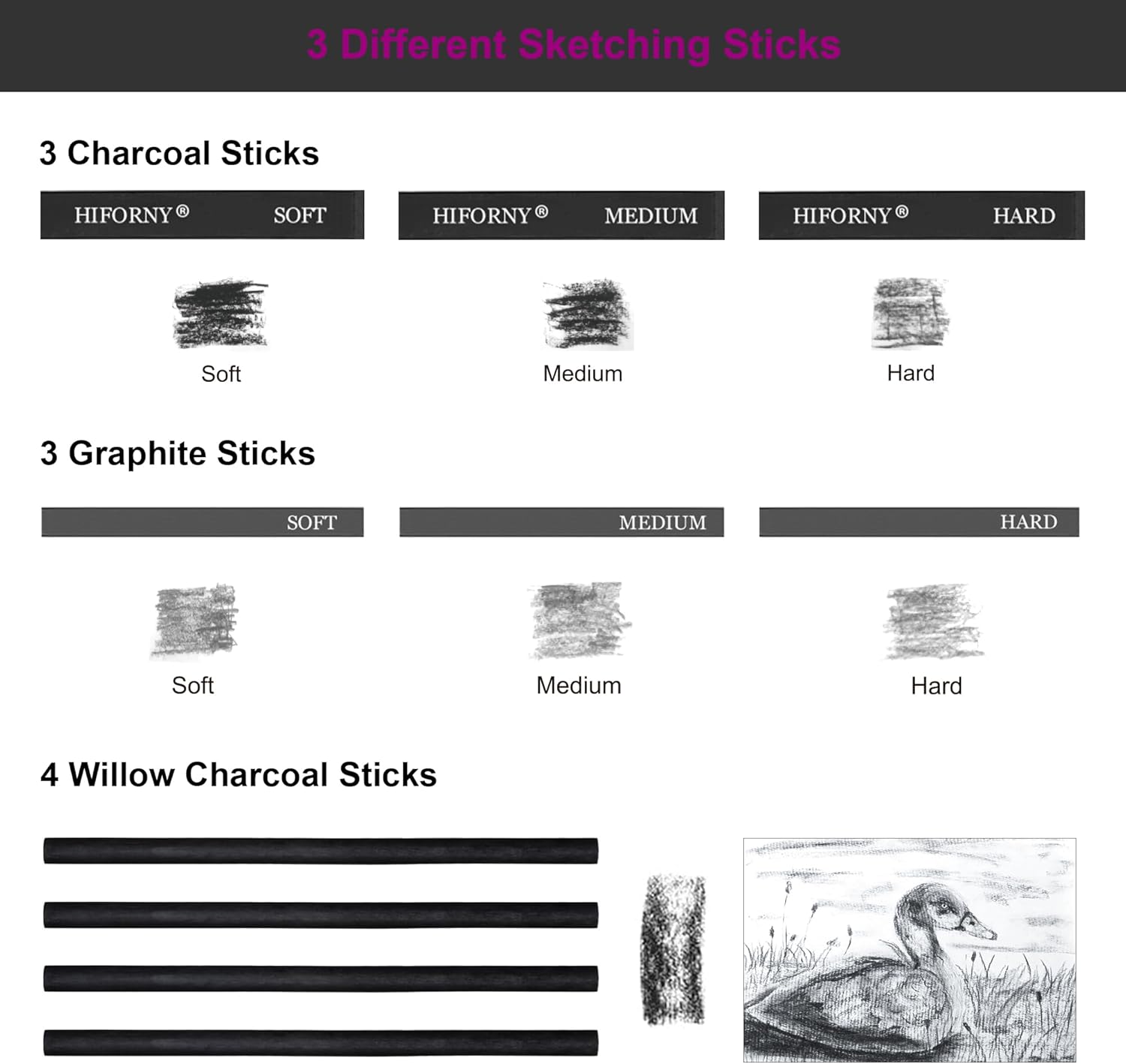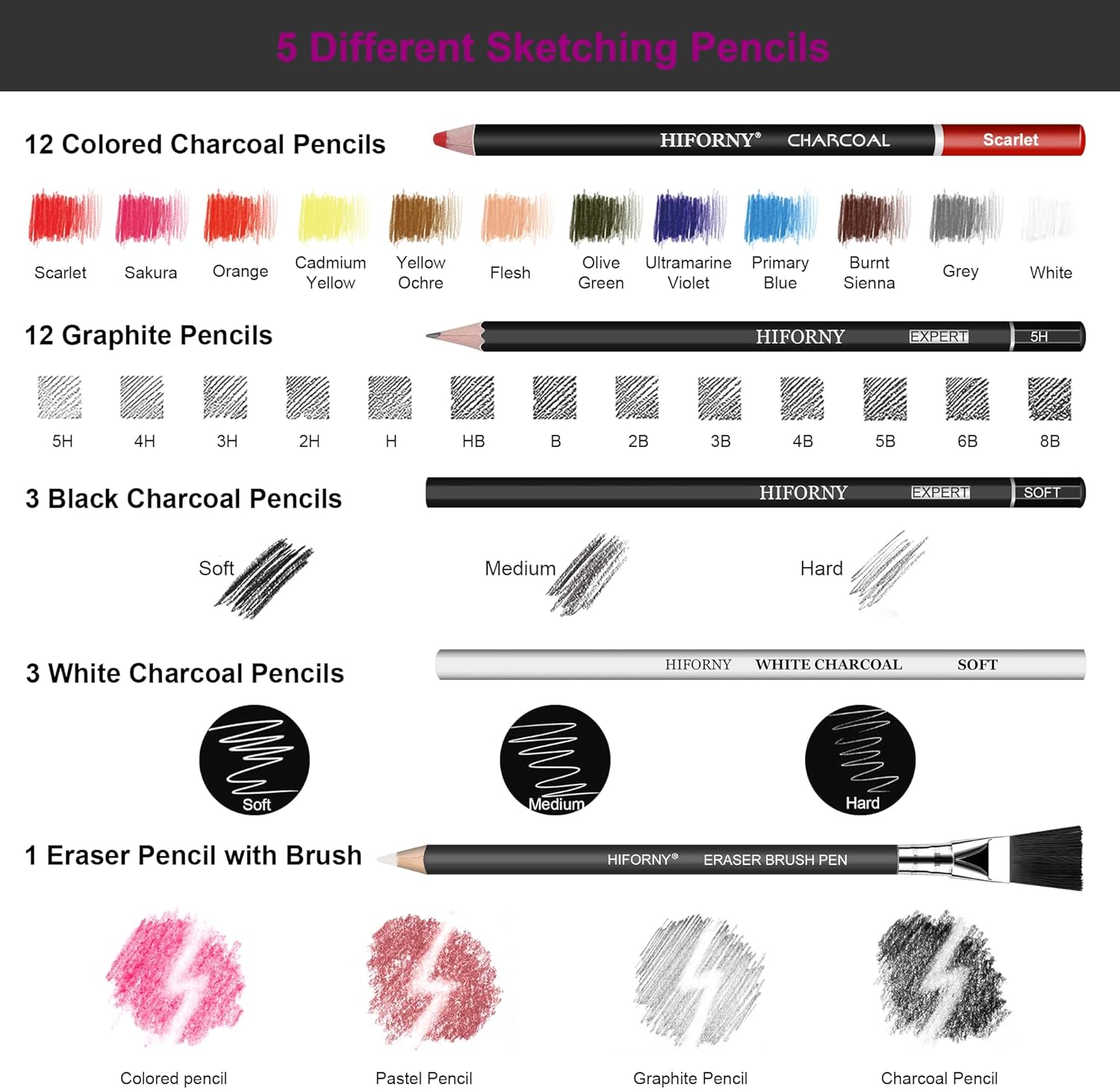 - Complete Drawing Pencil Set: HIFORNY 76 PCS sketching and drawing kit includes 12 premium graphite pencils (8B, 6B, 5B, 4B, 3B, 2B, B, HB, 2H, 3H, 4H, 5H), 12 Colored Charcoal Pencils, 3 black charcoal pencils, 3 white charcoal pencils, 1 eraser pencil with brush,4 willow charcoal sticks, 3 graphite and 3 charcoal sticks. Each pencil is clearly labeled for easy selection—perfect for sketching, shading, blending, and layering.