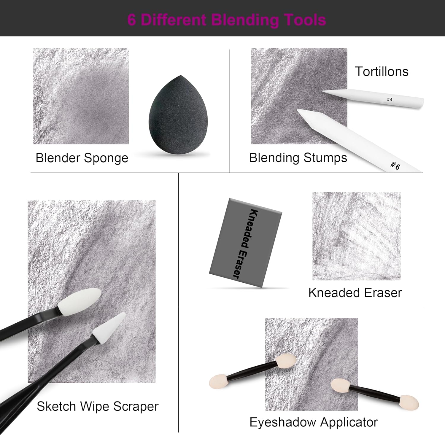 - Essential Drawing Tools: This versatile art set also includes 8 blending stumps(#1-#8), 4 tortillions(#1-#4), 2 sketch scrapers, 20 replacement heads, 6 eyeshadow applicators, 1 blender sponge, 1 white gel pen, 1 embossing pen,1 pencil extender, 1 plastic ruler, 1 kneaded eraser, 1 vinyl eraser, 2 sharpeners, 1 sandpaper block and 1 art knife—everything you need for detailed work and creative exploration. Great for both beginners and professional artists.