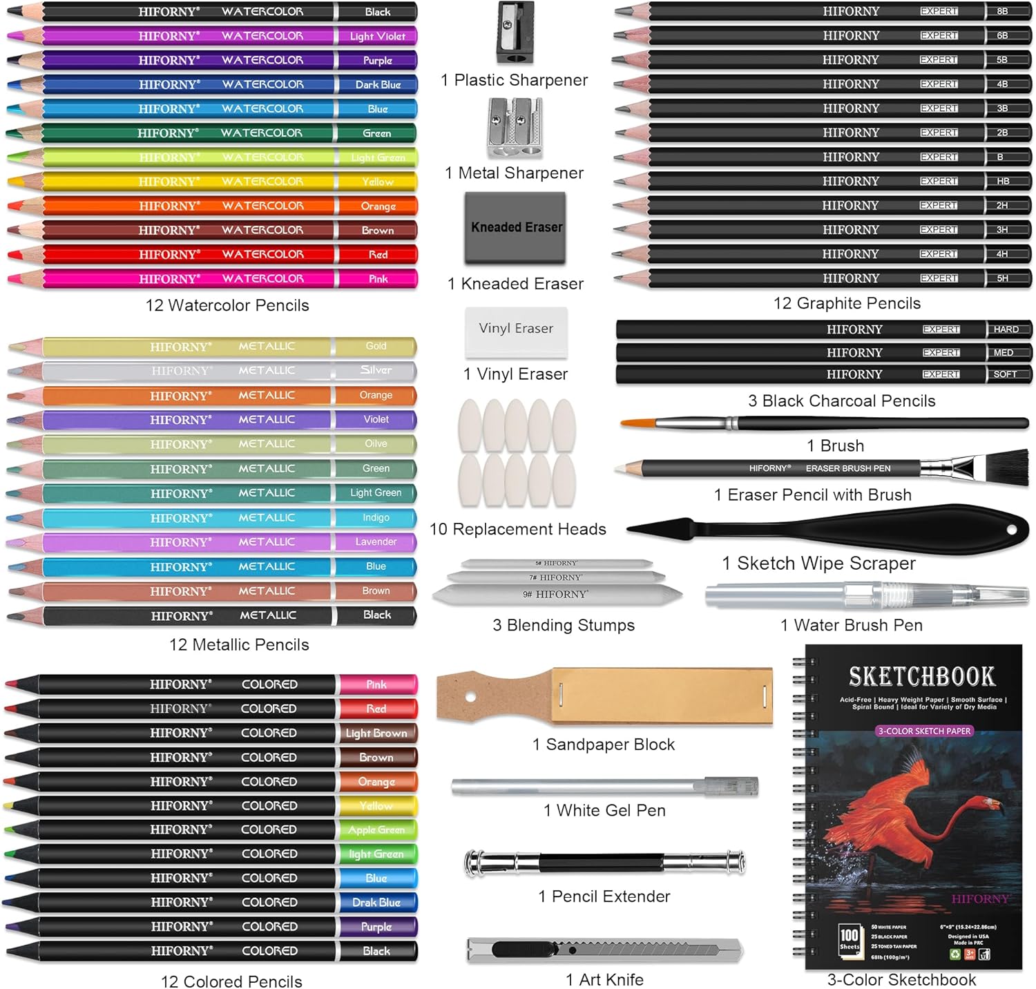 - Complete Drawing Supplies: HIFORNY 176 pack art set includes 6 types of professional drawing pencils.You can try various different drawing styles.These pencils include 3 charcoal pencils,12 graphite pencils,12 black edition colored pencils,12 watercolor pencils,12 metallic colored pencils,1 eraser pencil with brush.Each pencil is marked with name and model, perfect for drawing, sketching, shading, layering, blending, and more.