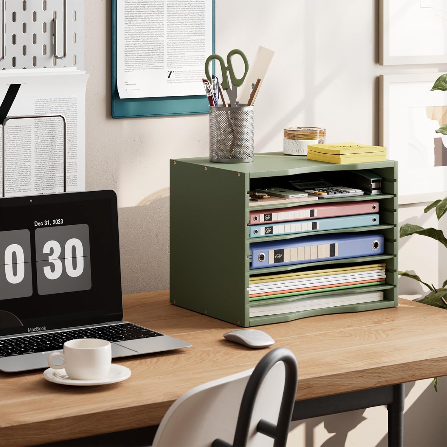 Bamjoy Bamboo 5 Tier Desktop Organizer, Paper Organizer Mail Sorter, File Holder Letter Document Storage with Adjustable Shelves for School Home Office, Forest Green
