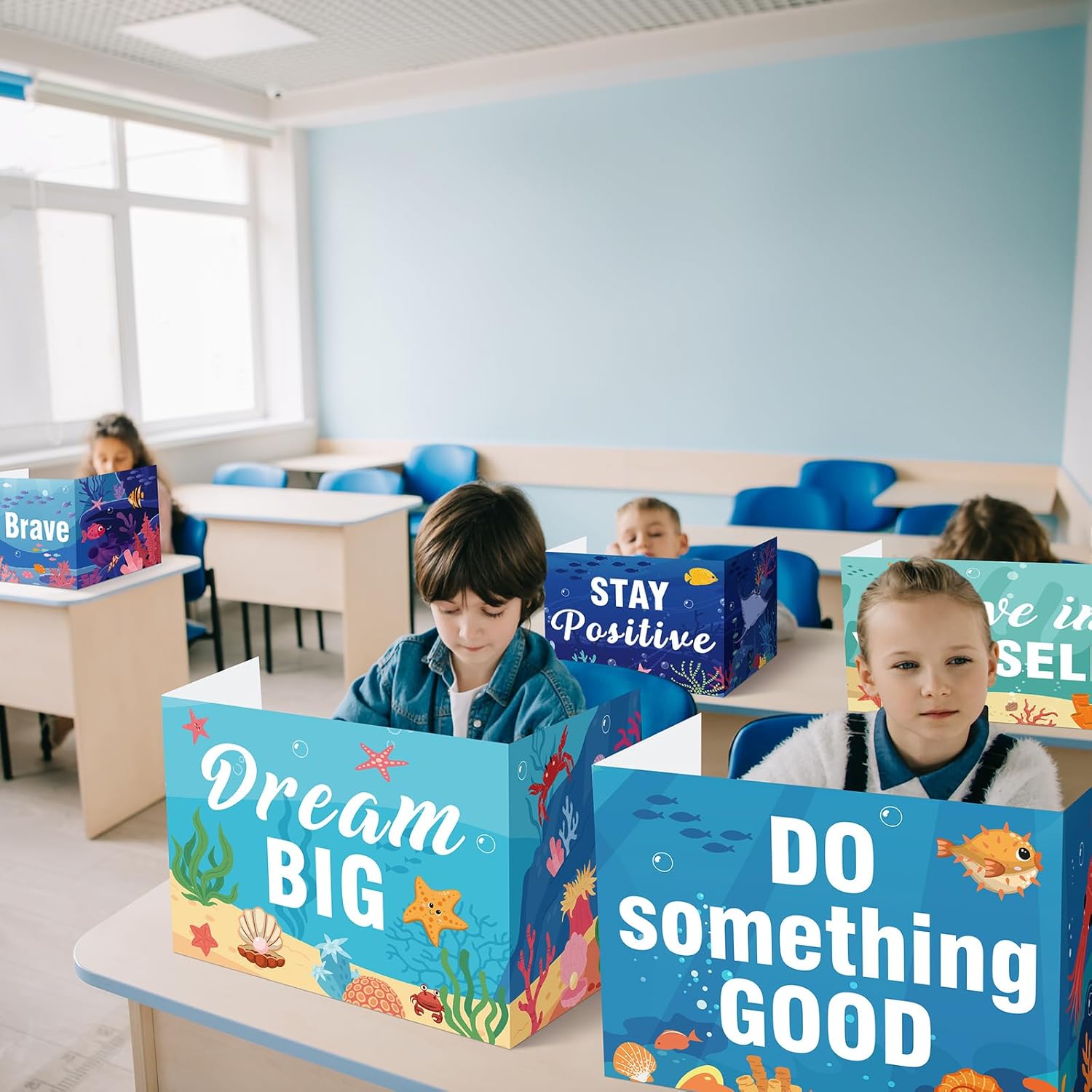 Honoson 24 Pcs Bulk Inspirational Privacy Folders for Students Cardboard Test Privacy Boards Motivational Words Desk Dividers Shield for Classroom School Study Supplies, 6 Styles (Ocean Animal)
