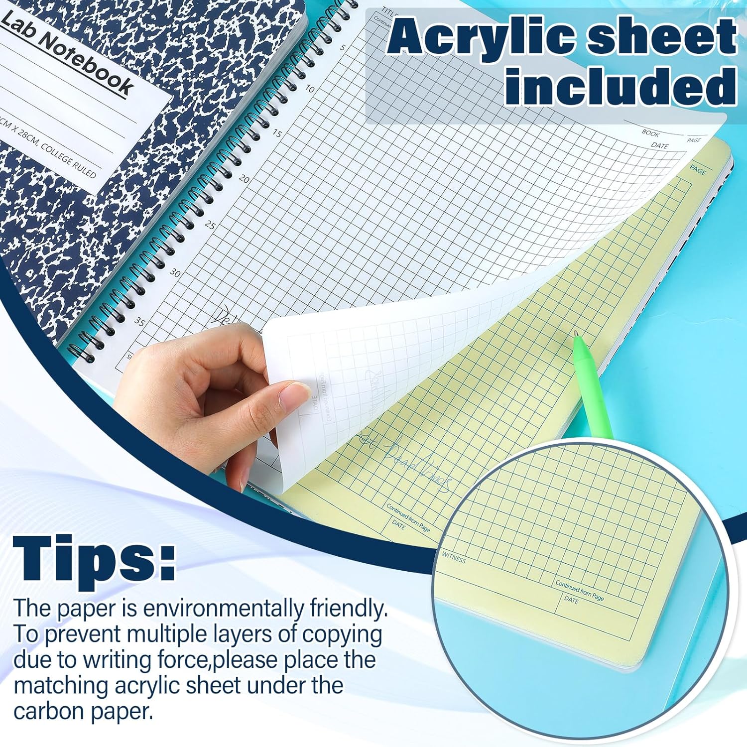 - Carbonless Lab Notebook: the set includes 2 carbonless copy notebook, measuring 8.5 x 11 inches/ 22 x 28 cm, each containing 50 writing pages and 50 sheets of carbon paper, a total of 100 pages, adequate quantity to meet your needs; Also included is a clear acrylic sheet measuring 8.5 x 11 inches / 22 x 28 cm; Lab notebook help to quickly generate copies of notes, thus simplifying the sharing or saving backups of important lab data