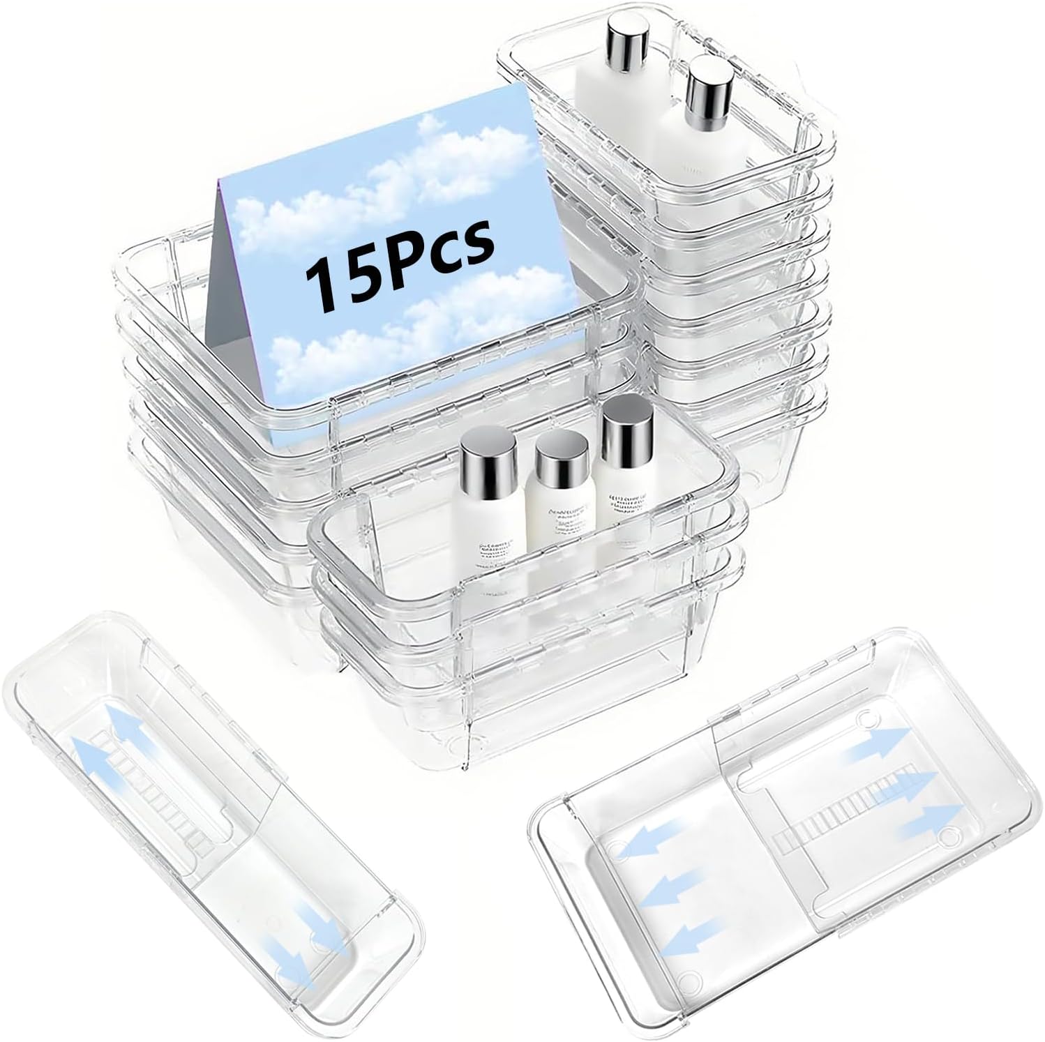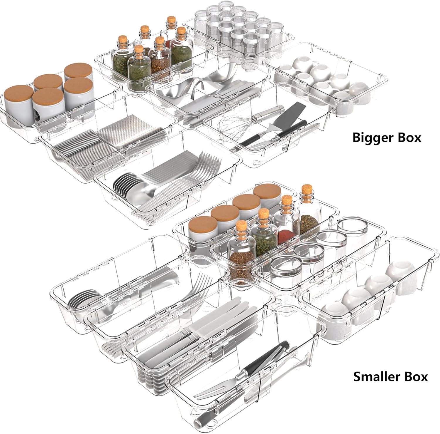 - 15 Pcs Adjustable Drawer Organizer Set: This adjustable bins set includes 2 different sizes: 5pcs large size (7-10.4" x 6.2" x 2.2" ), 10pcs medium size( 6.4-9.4" x 3.4" x 2.2" ).Our clear drawer organizer with extendable size, flexible combined,perfect for keeping your drawers well organized;In 2 size,fit all sizes drawers and items,meets your daily storage needs
