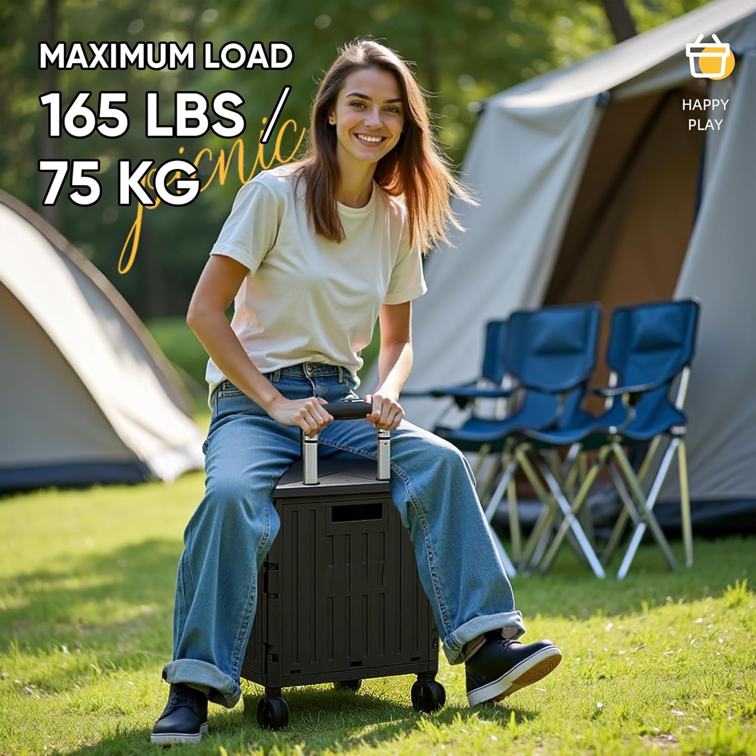 VUSIGN Folding Utility Cart, Foldable Rolling Crate Handcart with Lid, Portable Collapsible Shopping Trolley Tool Box, 4 Rotate Wheels for Grocery, Office, Travel, Teacher, Luggage, Black