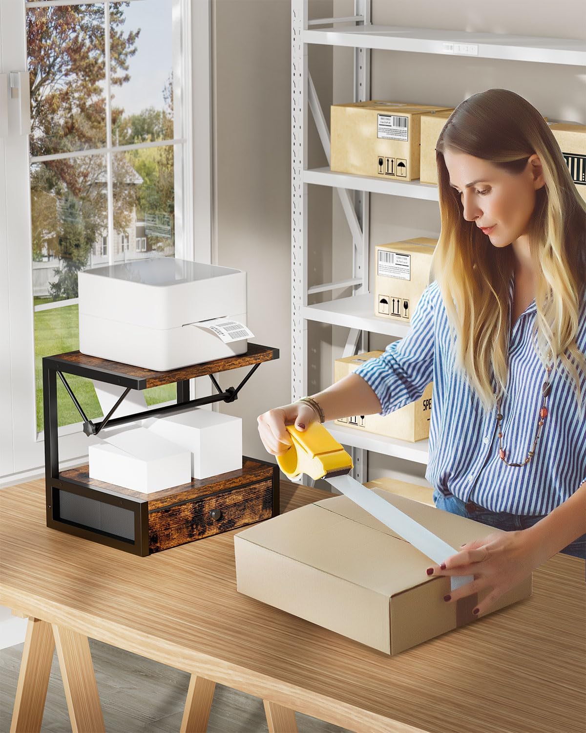 - With drawers: the top stores the printer, and the bottom drawer stores label rolls and folded labels. It not only saves space, but also ensures that your tags are organized neatly and easily accessible.