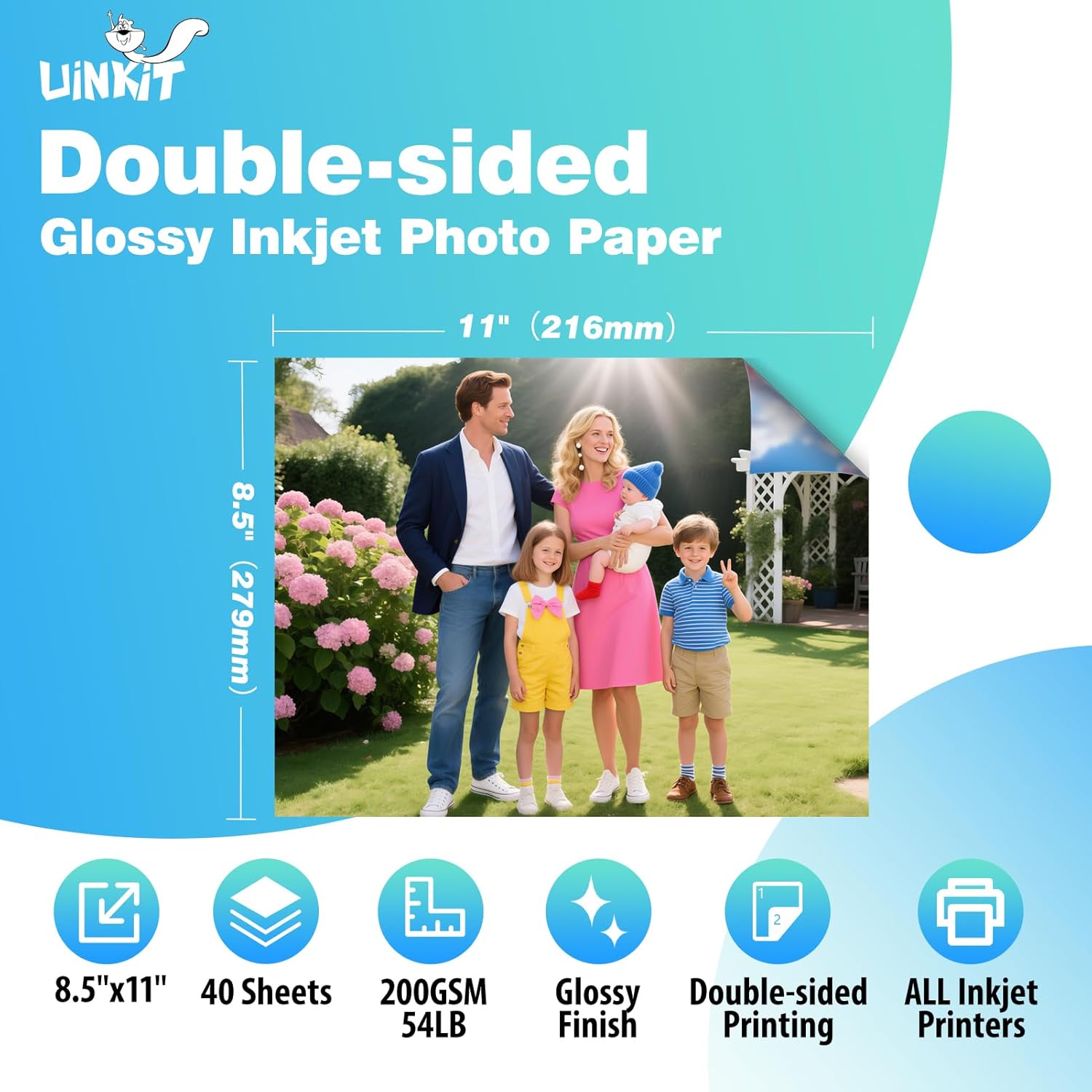 Uinkit Double Sided Photo Paper Glossy 40 sheets 8.5x11 54lbs Inkjet for Dye Ink 200Gsm Picture 8.5 x 11 9.5Mil for Inkjet Printing Printer