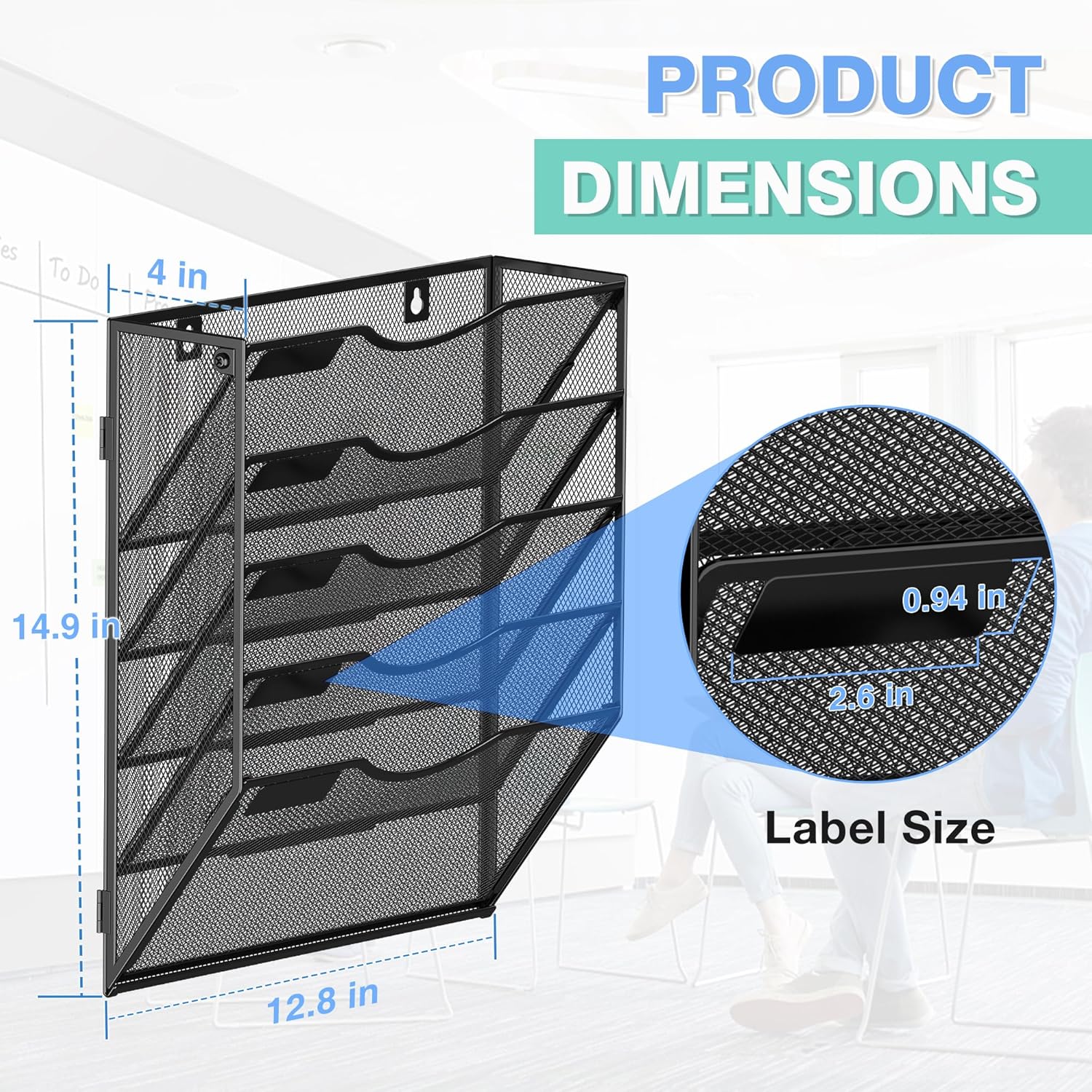 Kuntine.B Wall File Organizer Office Hanging Magazine Holder Wall File Organizer for Office Home (Black, 5 Tier & Hangers)