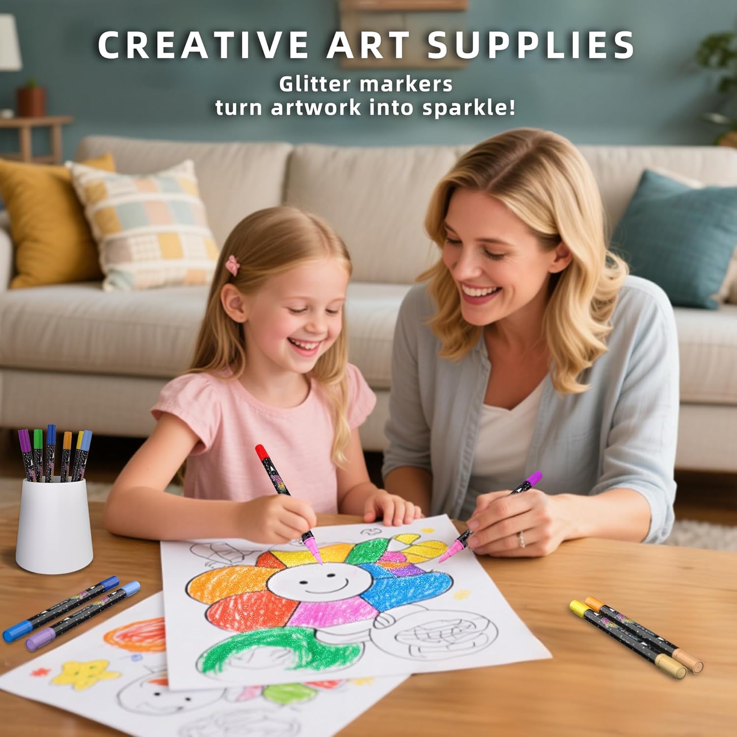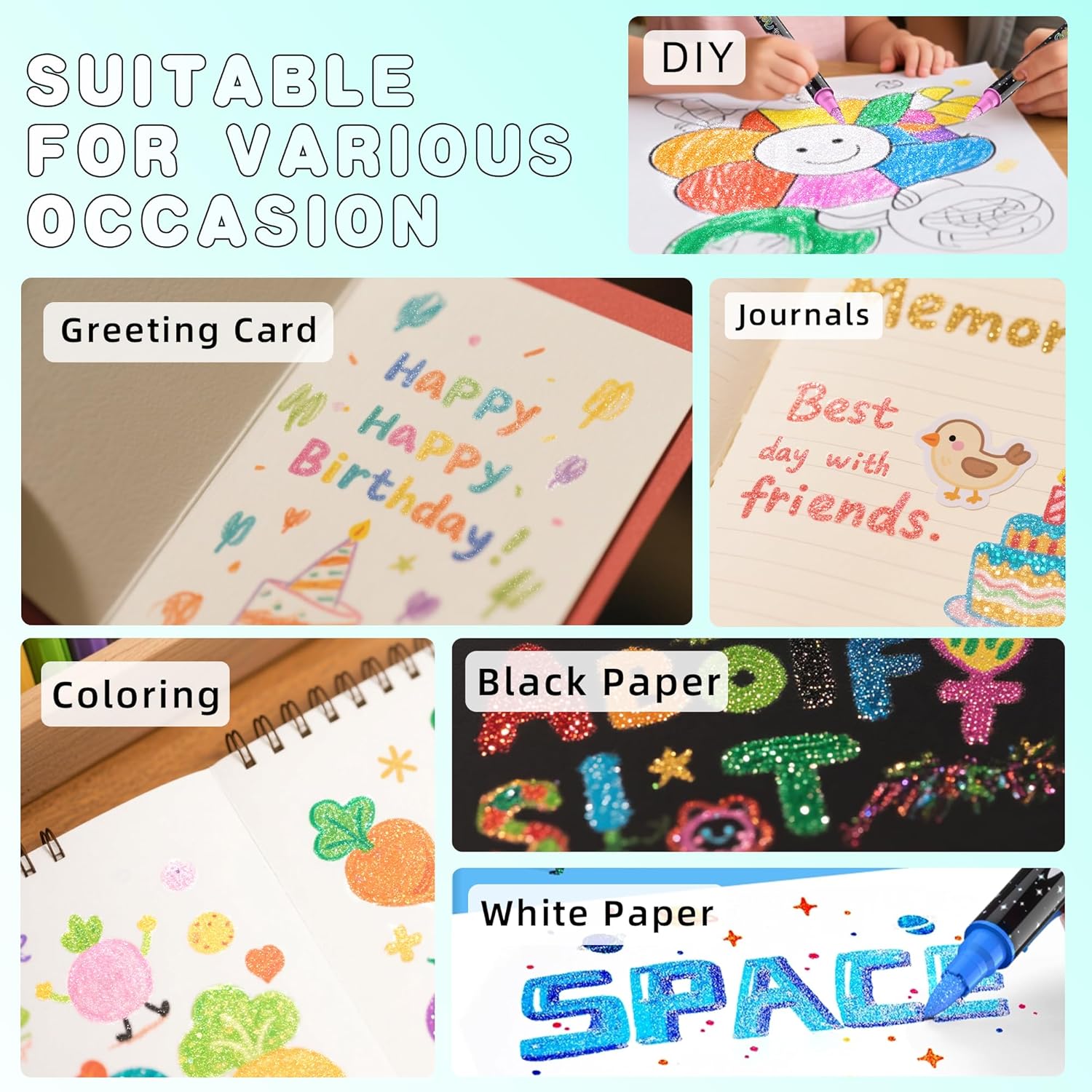- 【24 Colors Sparkling Glitter Markers】: These glitter pens blend rich pigmentation with eye-catching sparkle for stunning results,create art works that are pigmented beautifully,giving you endless possibilities. Whether you’re doodling, lettering, or decorating, these markers create bold, luminous artwork with every stroke.The glitter effect can make these coloring markers fun for both adults and kids.