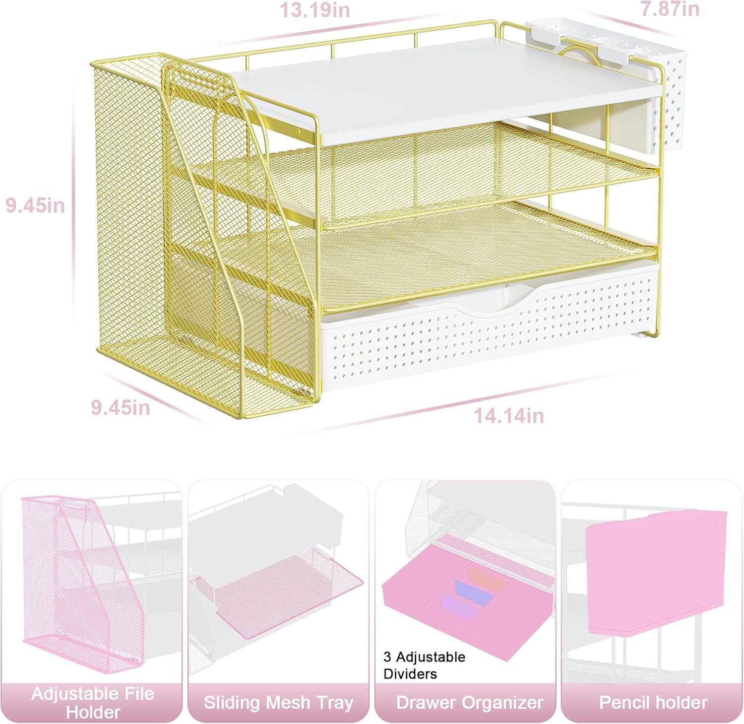 Wood Desk Organizers and Accessories with File Holder, 4-Tier Desk Accessories & Workspace Organizers with Drawer and Pen Holder, Paper Organizer for Office Supplies (Gold)
