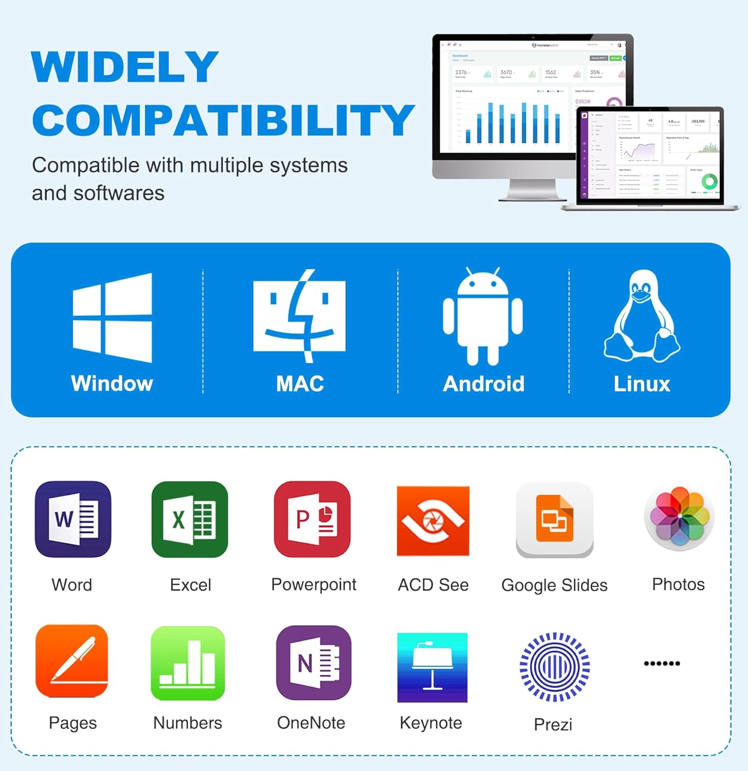 - PowerPoint Clicker with Multi-Features - Take full command of your presentations with multifunctional controls: Black/Full screen, Page navigation, Volume adjustment, Hyperlink activation, and more. This wireless clicker supports Windows 7/8+, Mac OS, Linux, and Android, and works with PowerPoint, Keynote, Prezi, and other popular software