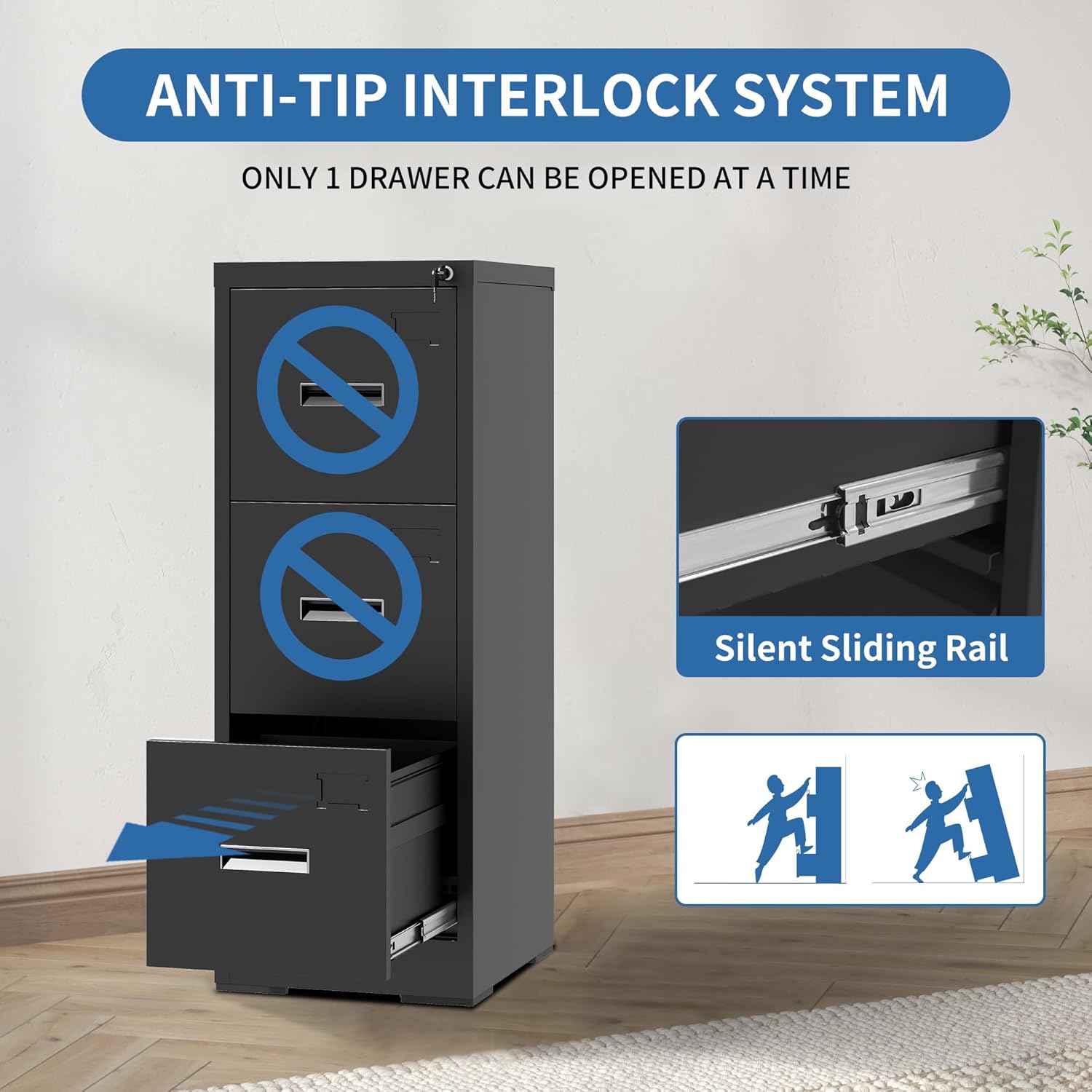 - 【Secure & Anti-tilt Design】Our office filing cabinets with 3 drawer feature a locking mechanism and anti-tip feature. When one drawer is opened, the interlocking drawer system prevents the other drawers from opening, preventing tip-overs and increasing safety.