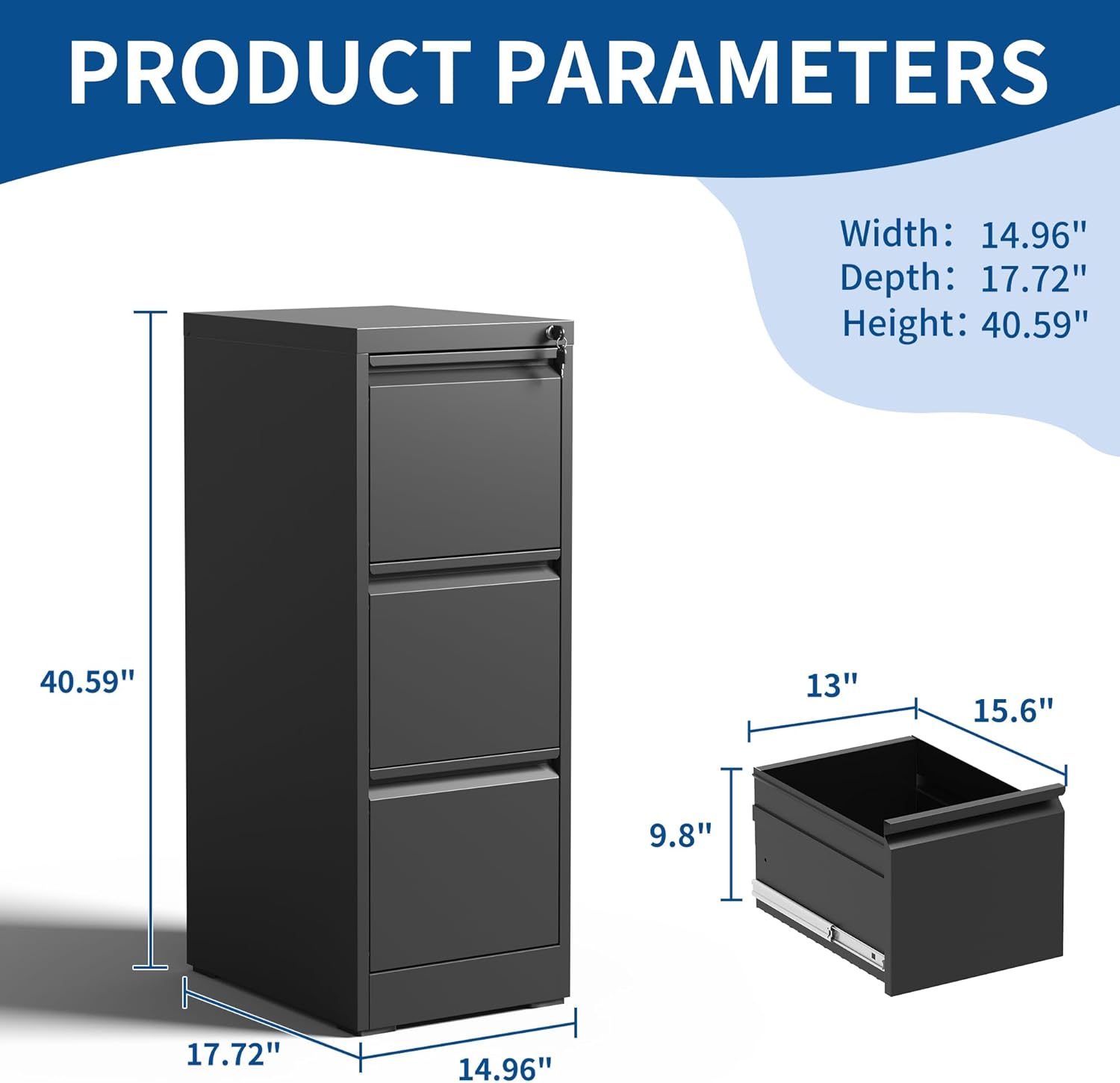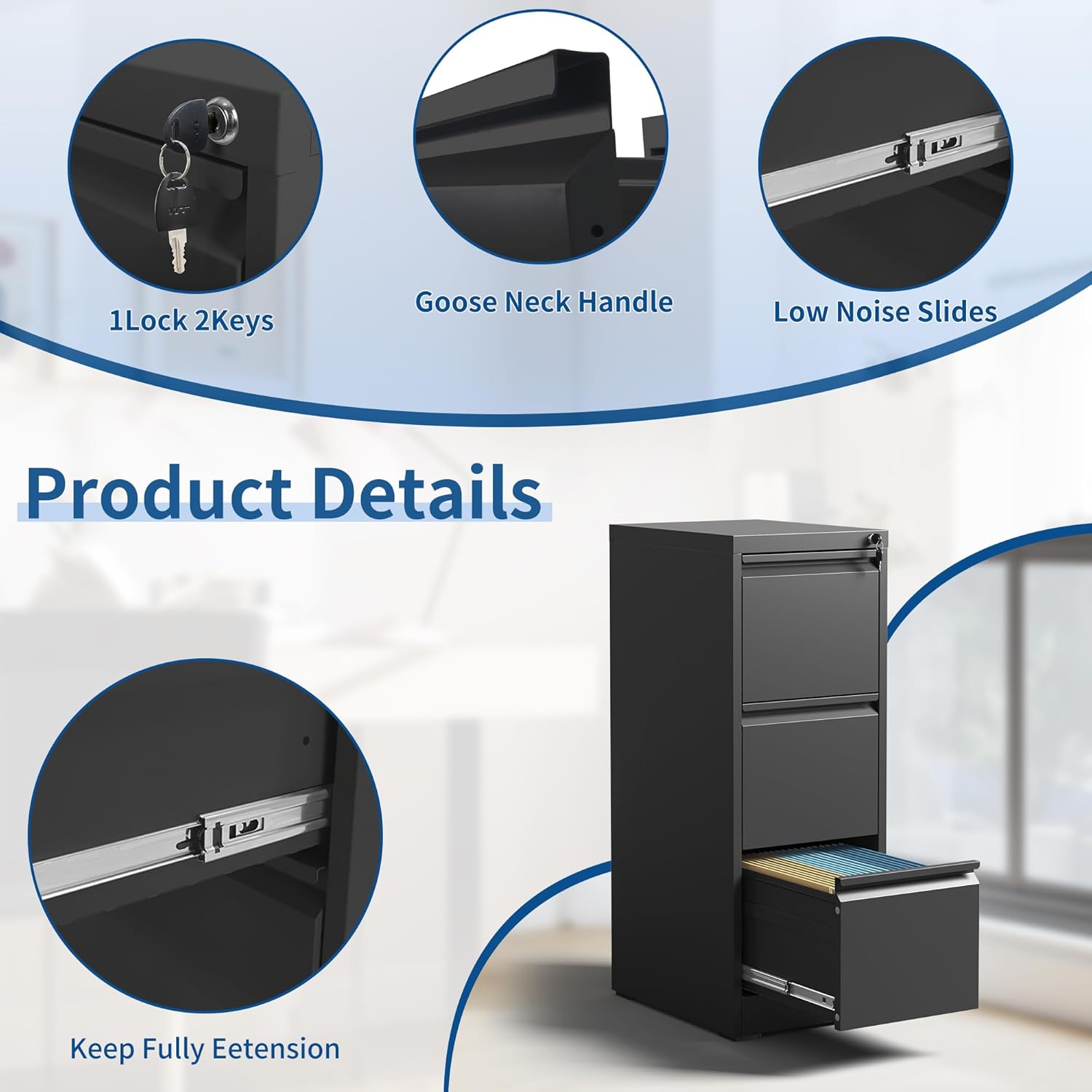 3-Drawer Locking Vertical File Cabinet, Metal Storage Cabinet for Office/Home – Secure Vertical Filing for Letter/Legal/A4/F4 Documents, Easy to Assemble Steel Cabinet, Black (Black, 3 Drawer-40 H)