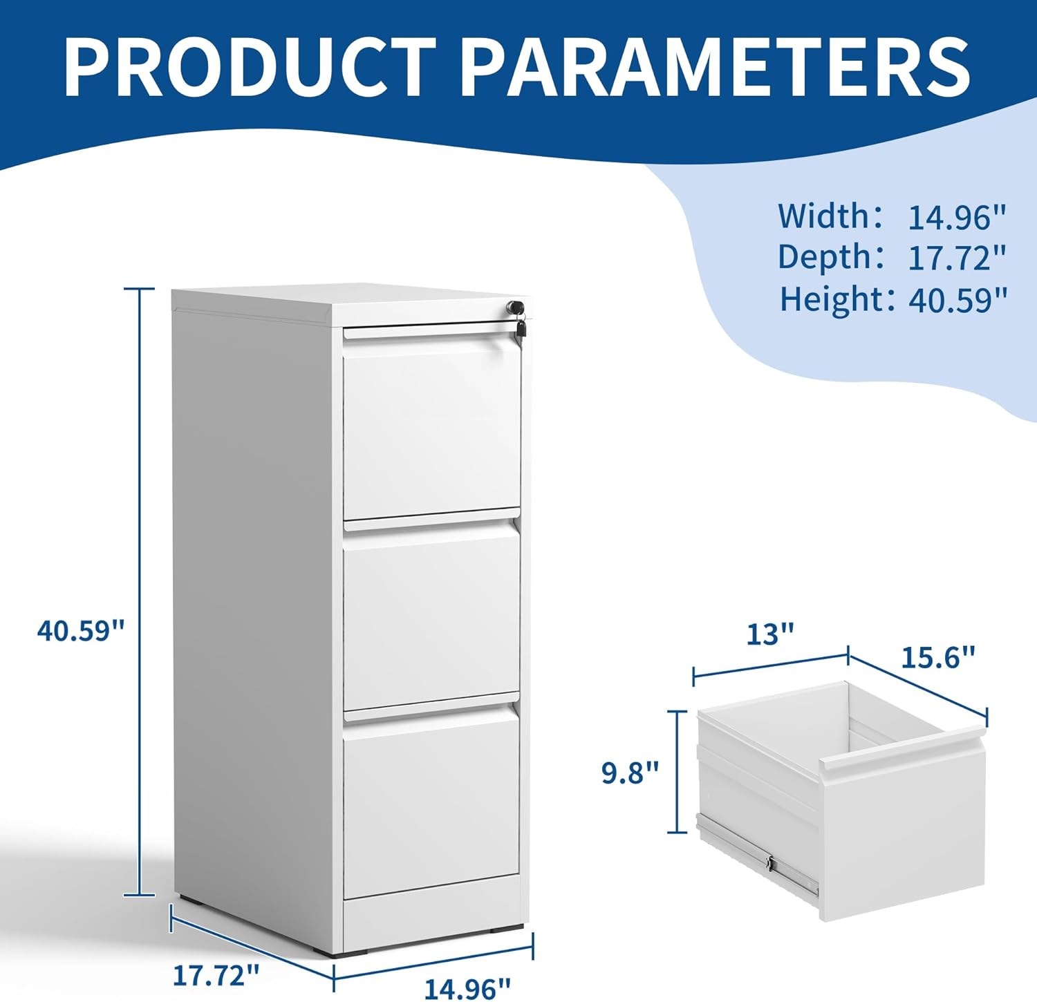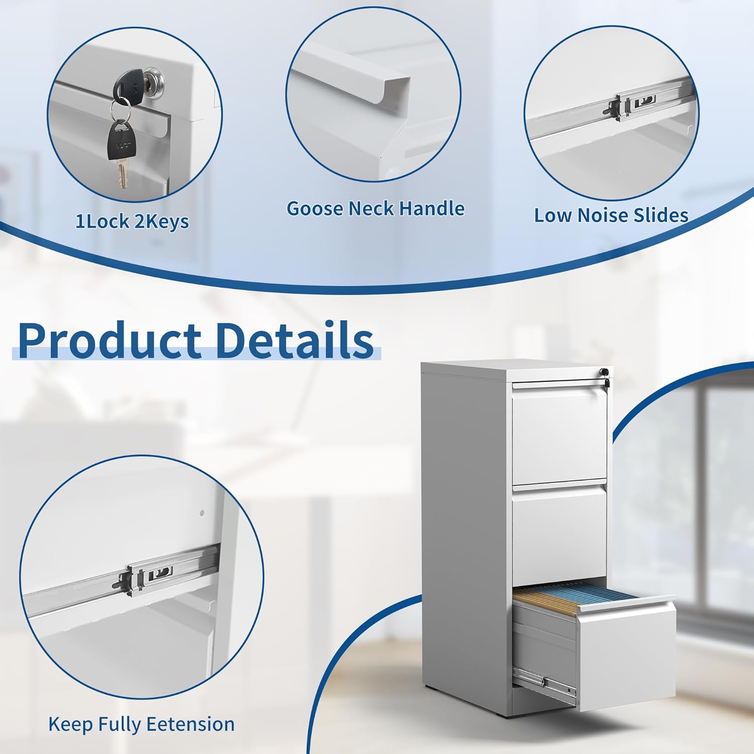 3-Drawer Locking Vertical File Cabinet, Metal Storage Cabinet for Office/Home – Secure Vertical Filing for Letter/Legal/A4/F4 Documents, Easy to Assemble Steel Cabinet (White, 3 Drawer-40 H)