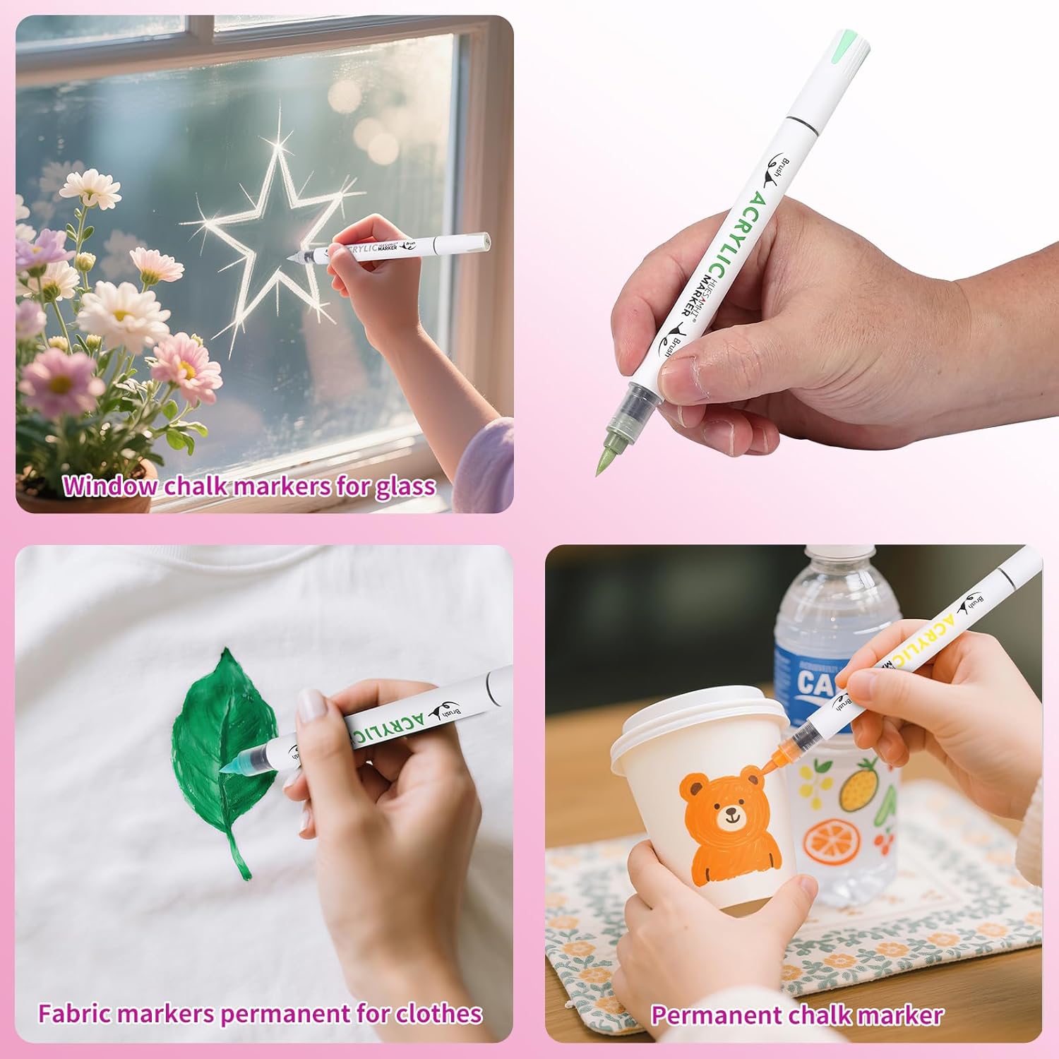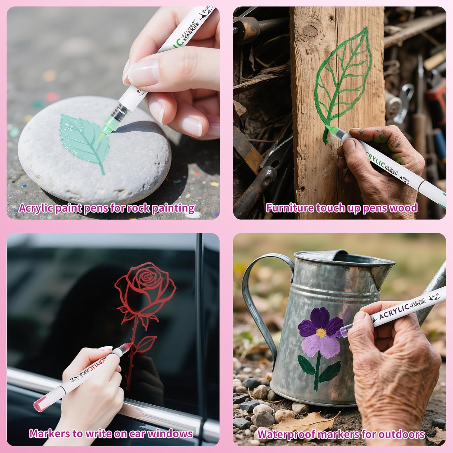Dual Tip Brush Markers, 4 Pack Double Ended Acrylic Paint Pens - Permanent Water-Based for Rock Painting, Wood, Metal, Ceramic, Glass, Crafts & Kids Art Assorted Colors