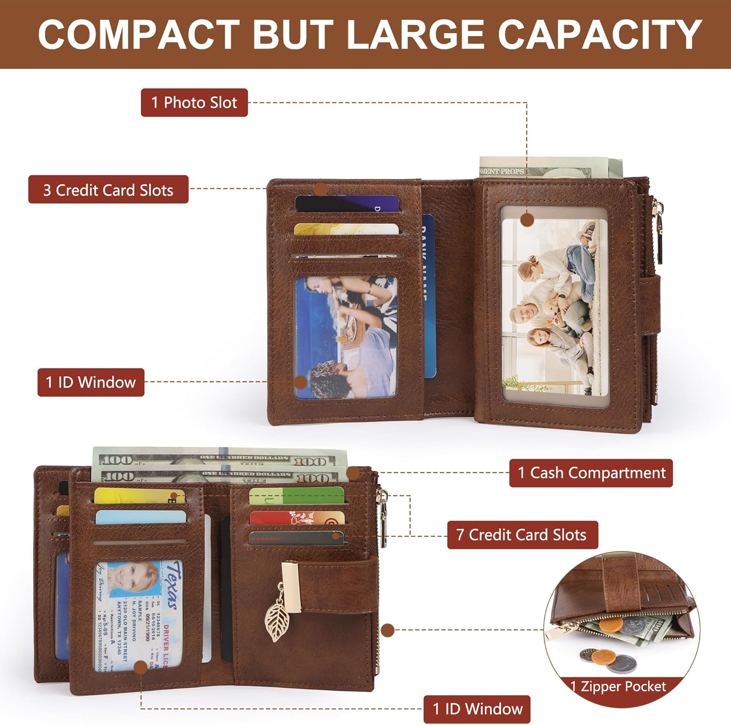 - Small Compact Women's Wallet: With 10 RFID-block credit card slots, 2 ID windows, 1 zipper coin pocket, 1 clear window picture slot and 1 currency slot, this small wallet for women can meet all your daily demands.