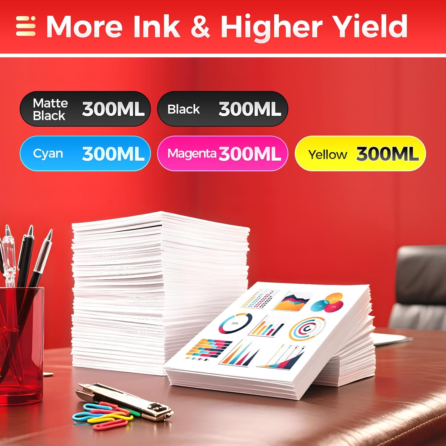 - Ink Volume: The capacity is 300ML per ink cartridges, Total ink volume is 1500ml. (2889C001AA, 2892C001AA, 2891C001AA, 2893C001AA, 2890C001AA)