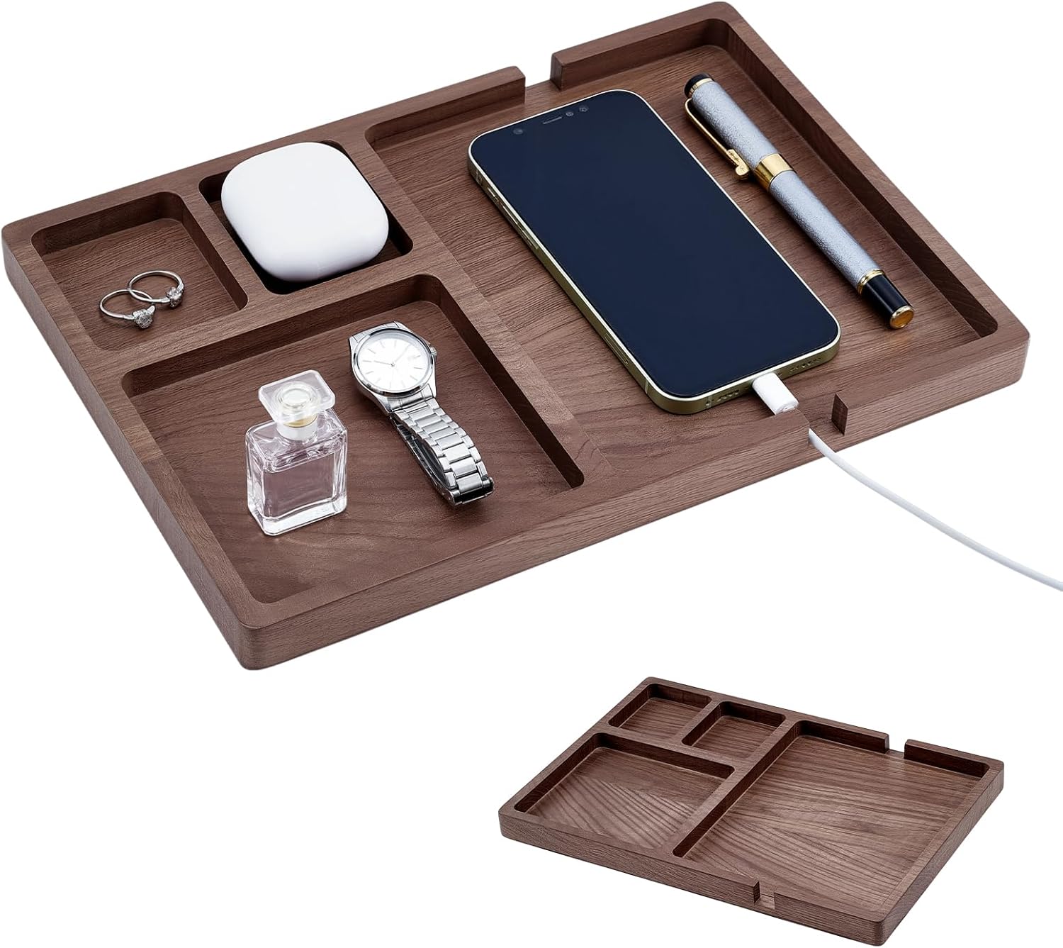 - ✔【Premium Materials】Our walnut valet tray is crafted from durable walnut wood with a rectangular design. The exquisite wood grain adds natural beauty and a unique texture to this storage tray. The 0.25-inch opening allows for convenient phone charging, providing a stylish and multifunctional storage solution for bedsides and desks.