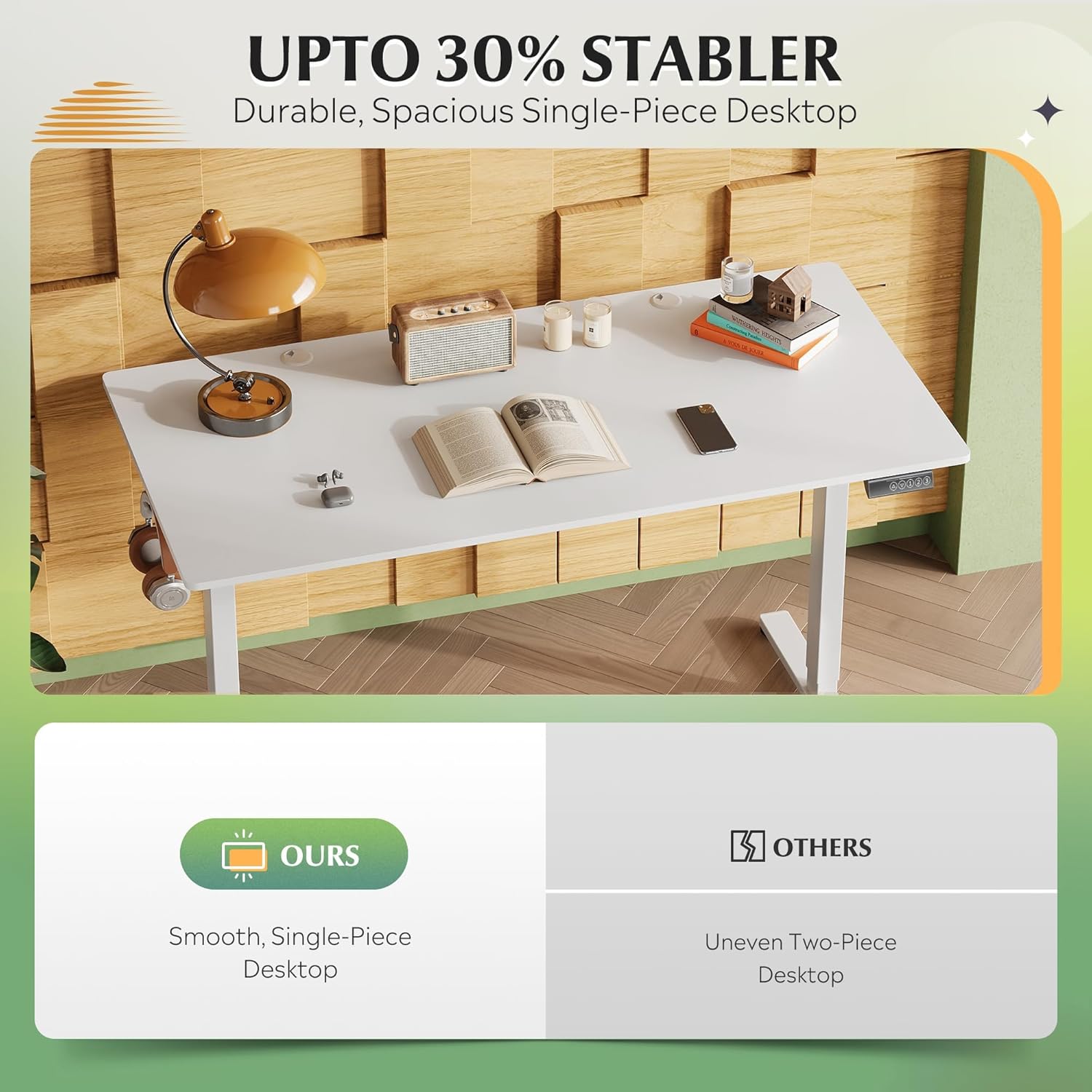 - Seamless One-Piece Desktop: Our stand up desk features a smooth, one-piece desk surface without visible seams. Unlike other models with joined panels, this seamless design offers 30% enhanced stability to provide a solid foundation for your equipment.