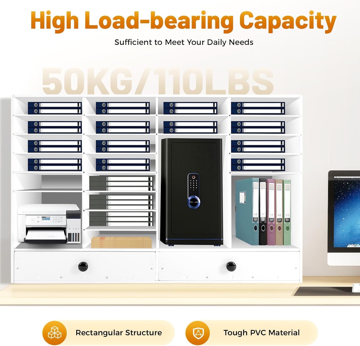 Adjustable Literature Organizer, 32 Slots File Folder Organizer Storage Rack Desktop Letter Office Cabinet 32 Compartment with 2 Drawers Paper Storage Cabinet for Classroom (32+2-Slot-White)