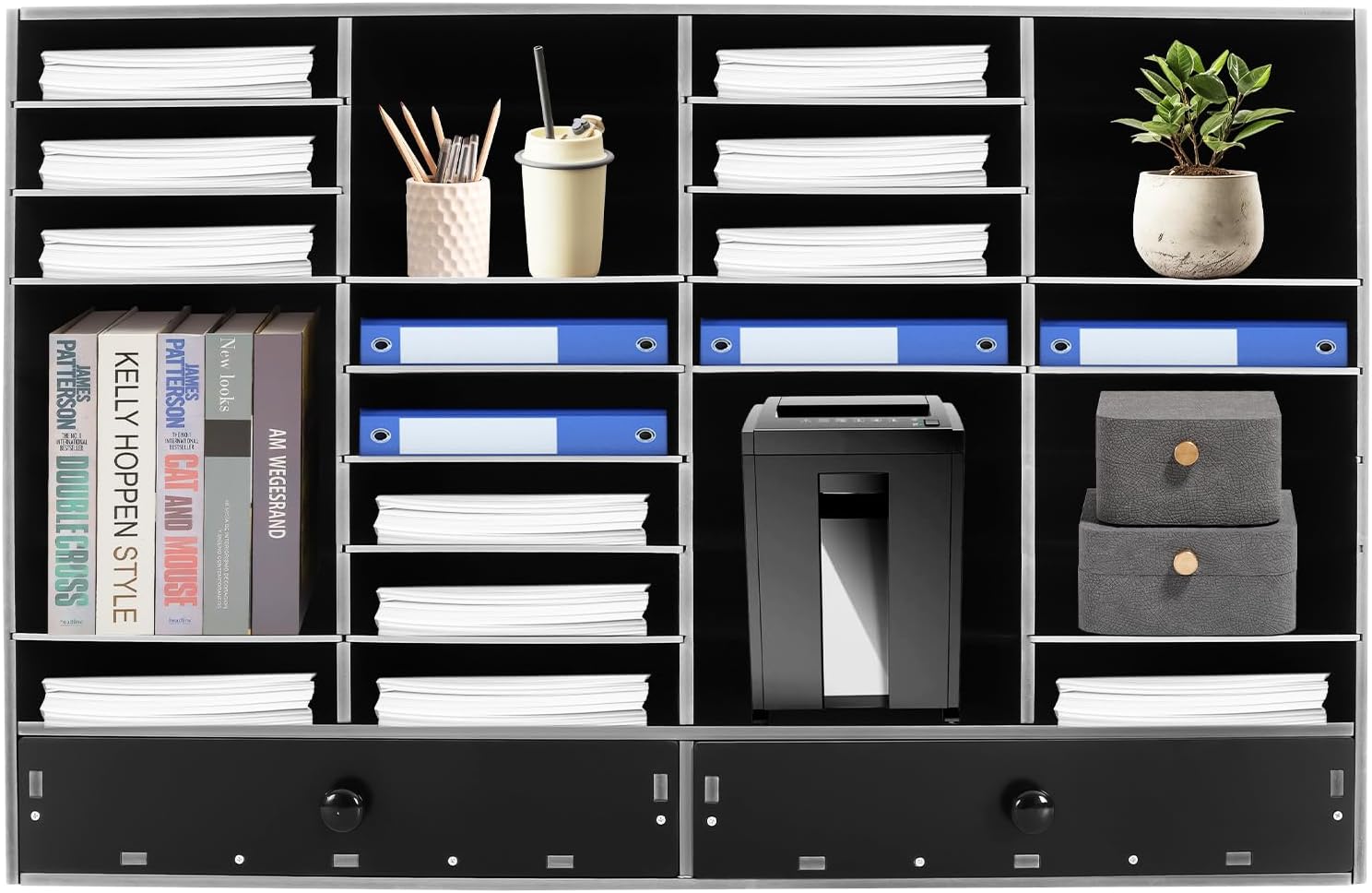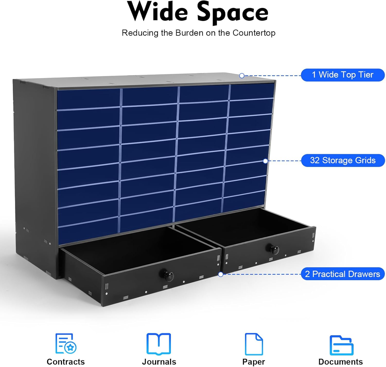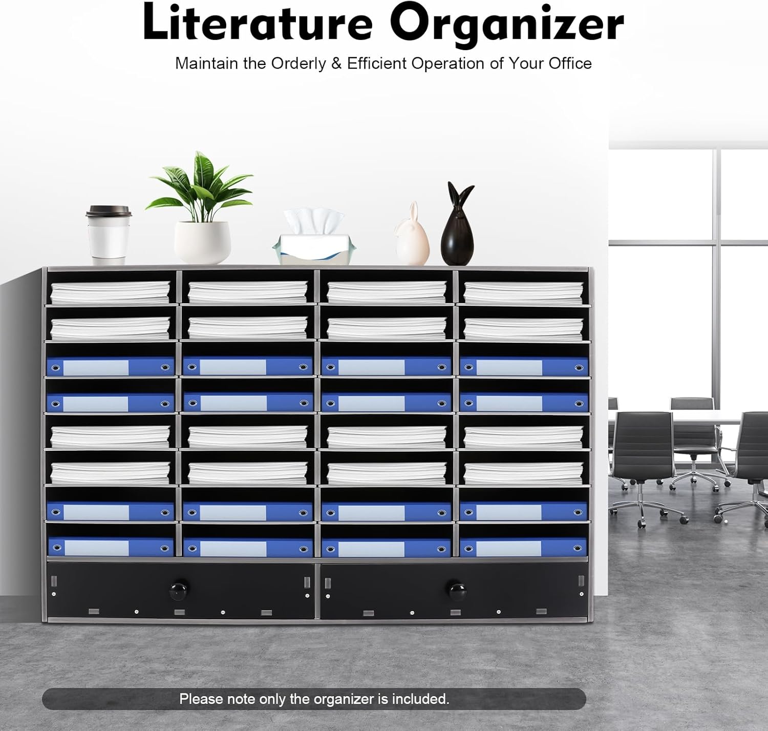 Adjustable Literature Organizer, 32 Slots File Folder Organizer Storage Rack Desktop Letter Office Cabinet 32 Compartment with 2 Drawers Paper Storage Cabinet for Classroom (32+2-Slot-Black)