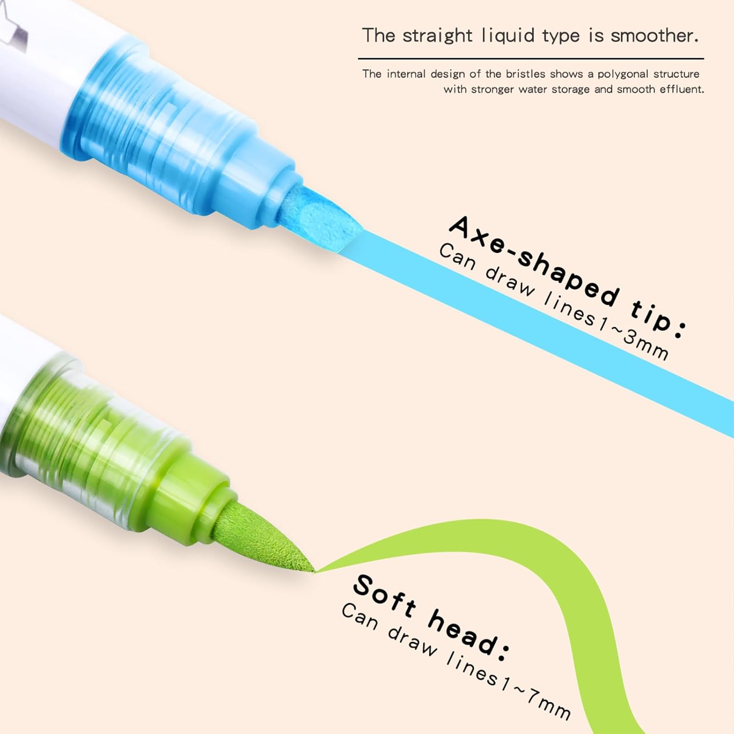 - Dual Tip Design: Two tips in one marker — a fine tip (1–3mm) for precise lines and detailing, and a soft flexible brush (1–7mm) for coloring and shading.